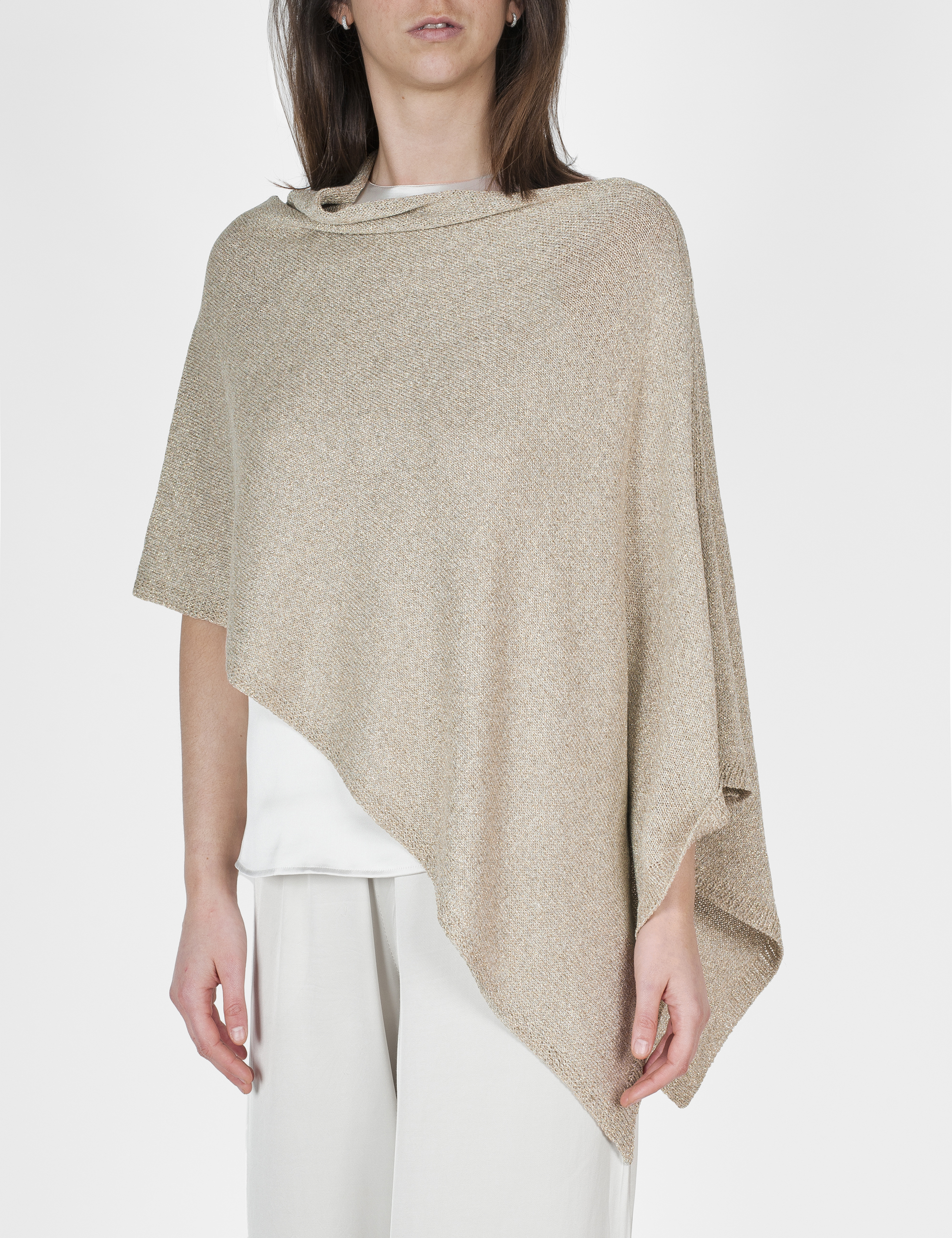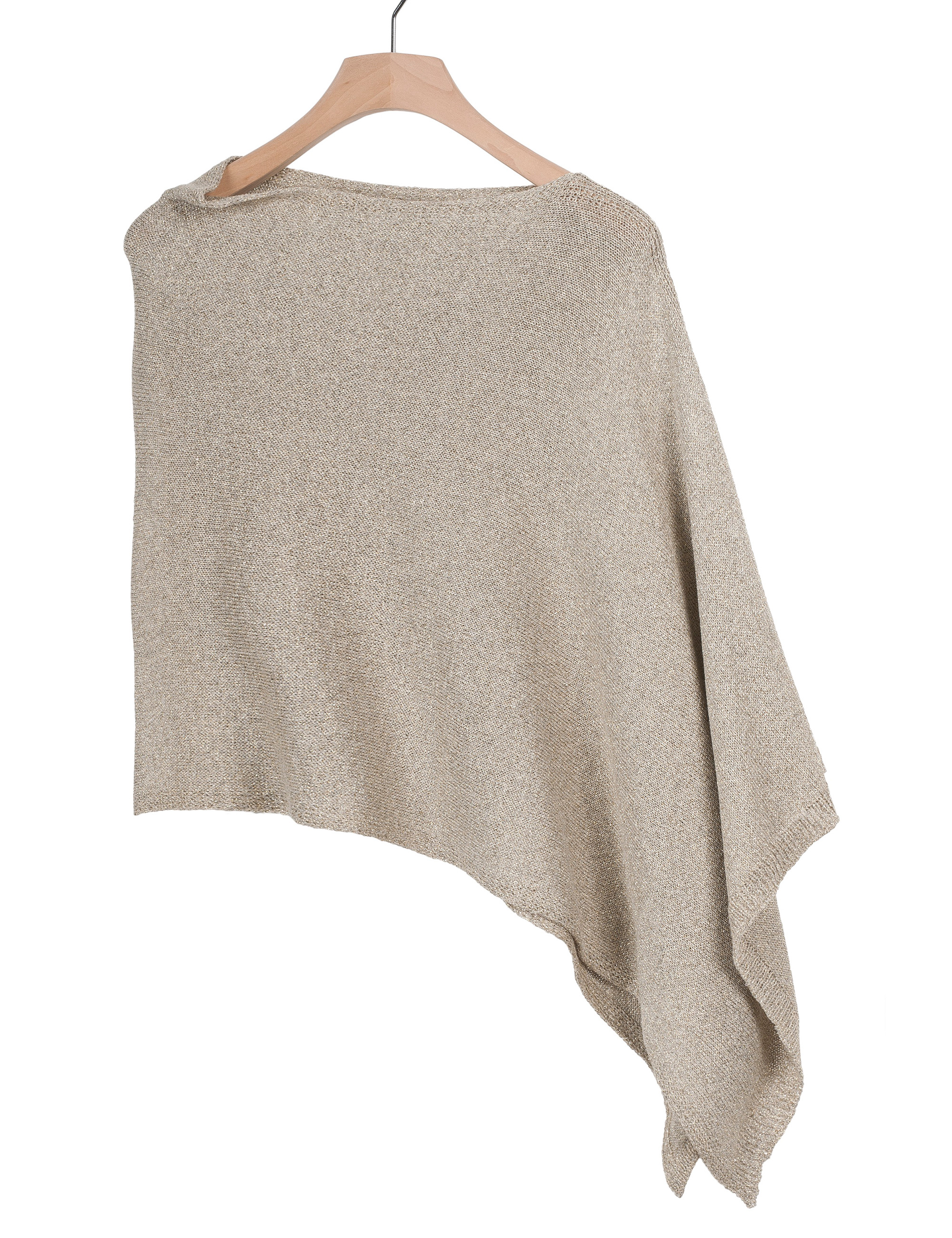 Golden poncho in a soft fabric, embellished with shimmering lurex threads that elegantly catch the light. Its enveloping and asymmetrical design adds a touch of dynamism and sophistication, perfect for enhancing any outfit with a refined allure. Ideal for special occasions or to bring a chic accent to everyday looks.