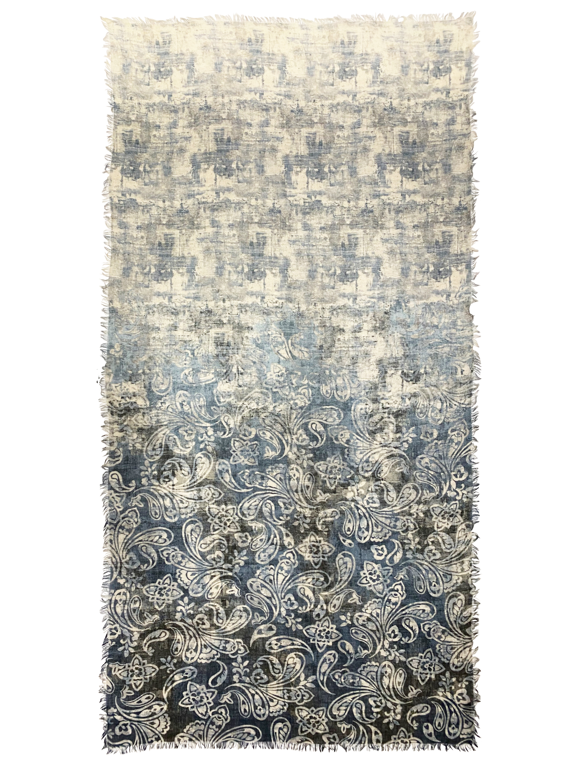 Large and enveloping stole characterized by an abstract background enriched by a fading paisley print on shades of blue and grey.