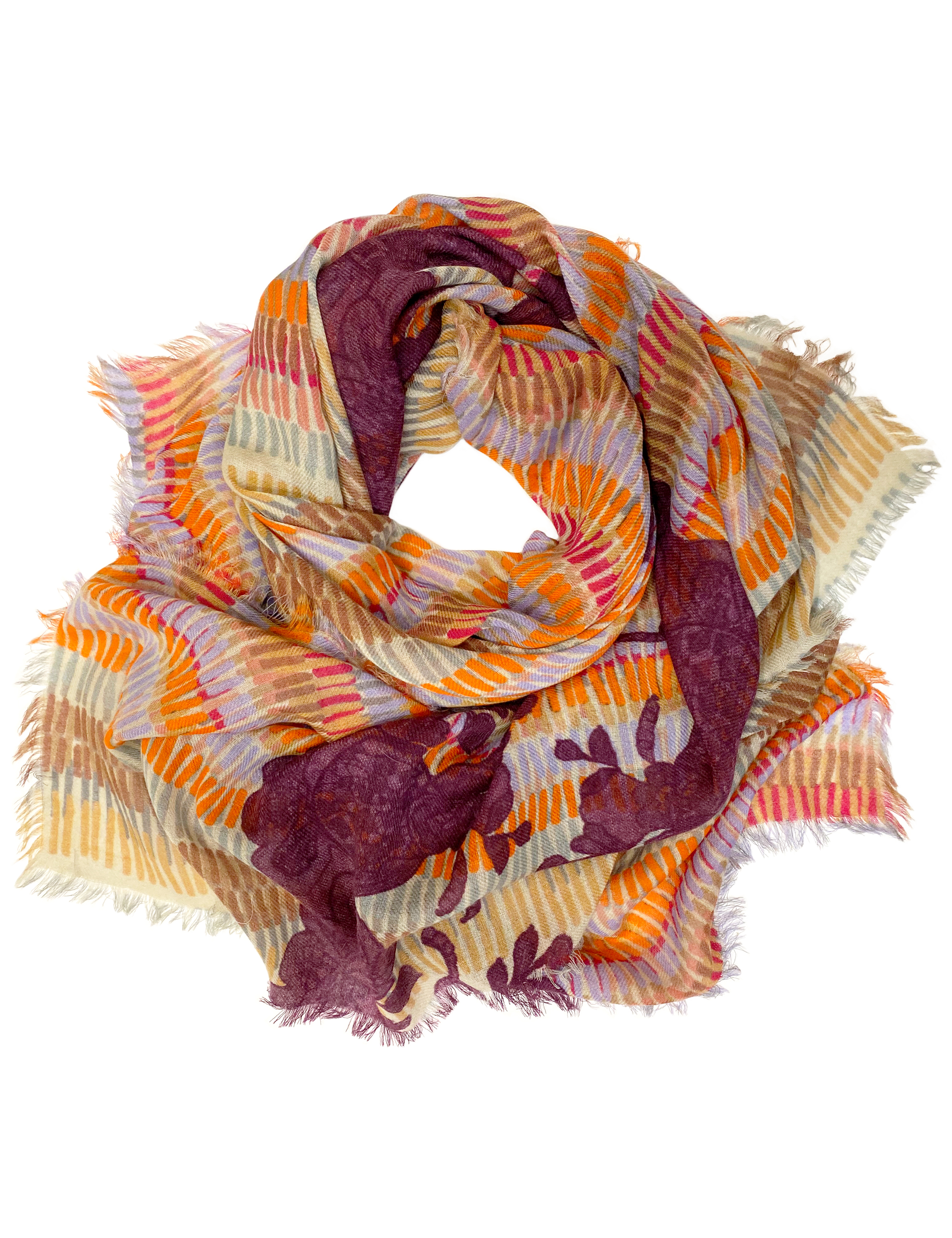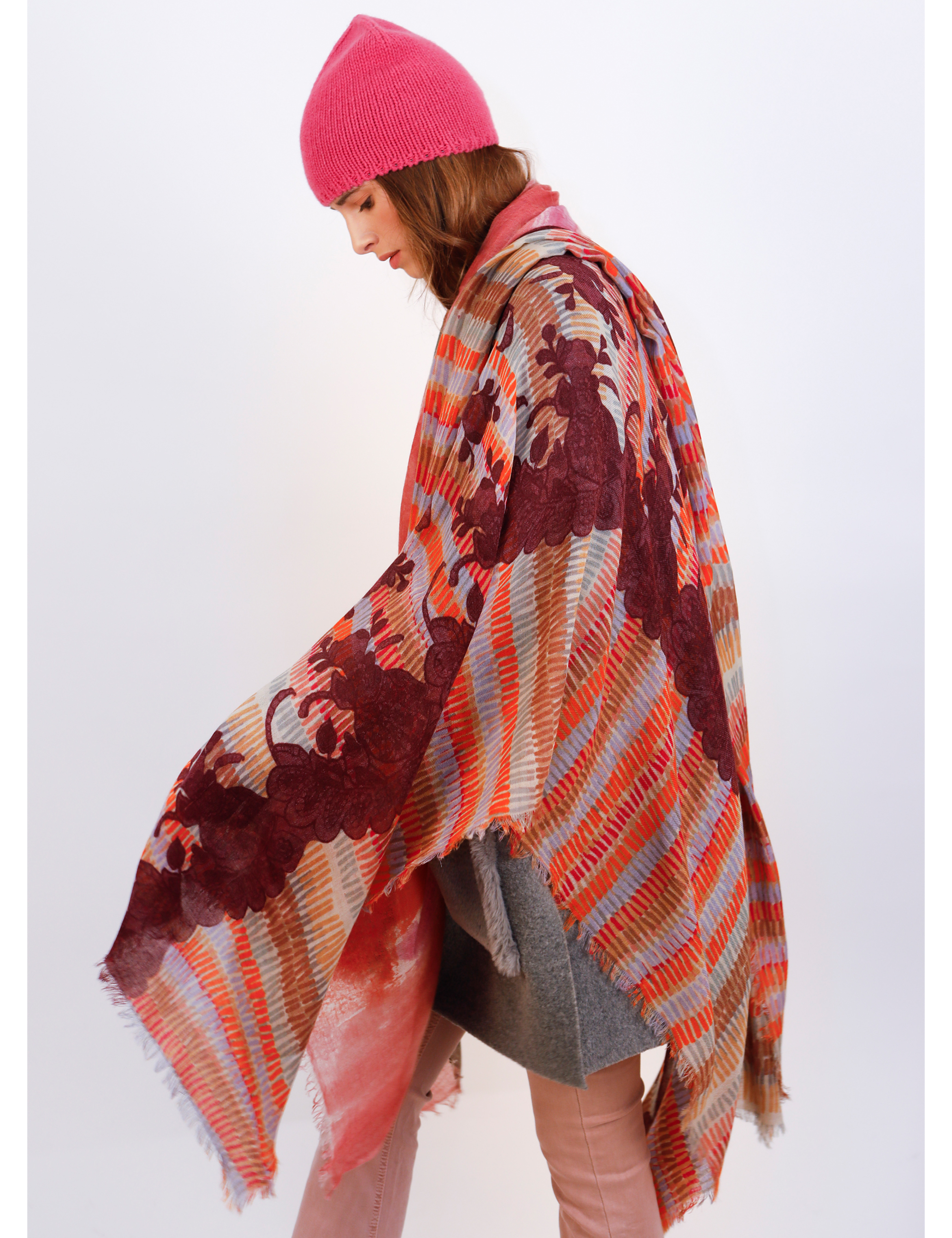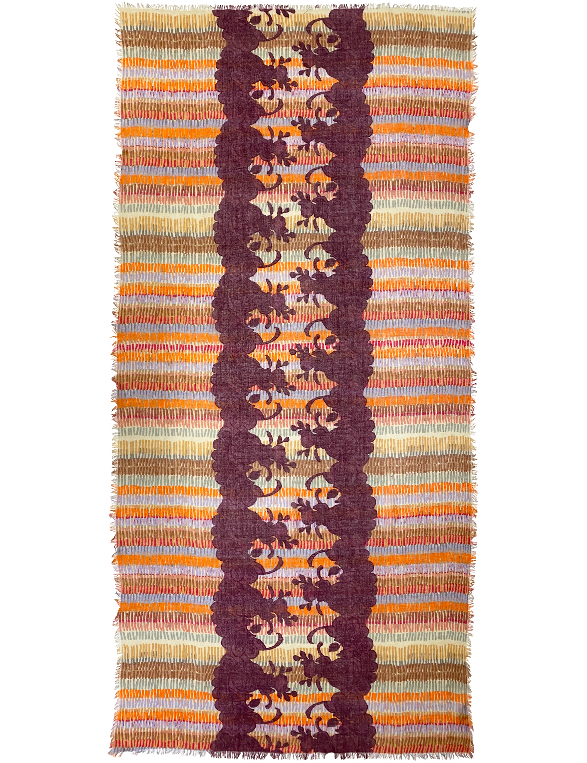 Large and enveloping stole enriched by a stylized striped background overlaped by a macro lace in shades of purple.