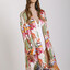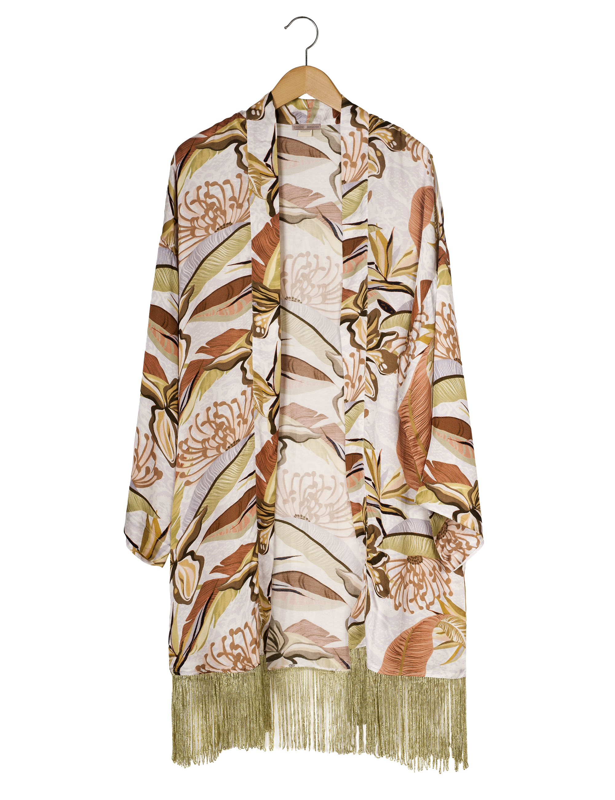 Sophisticated and soft kimono made of viscose satin characterized by a digital print that tells the story of a tropical garden. Enriched with a colorful fringe.