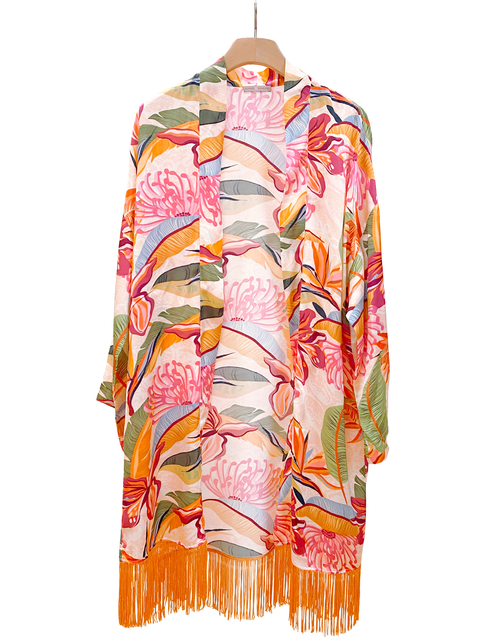 Sophisticated and soft kimono made of viscose satin characterized by a digital print that tells the story of a tropical garden. Enriched with a colorful fringe.