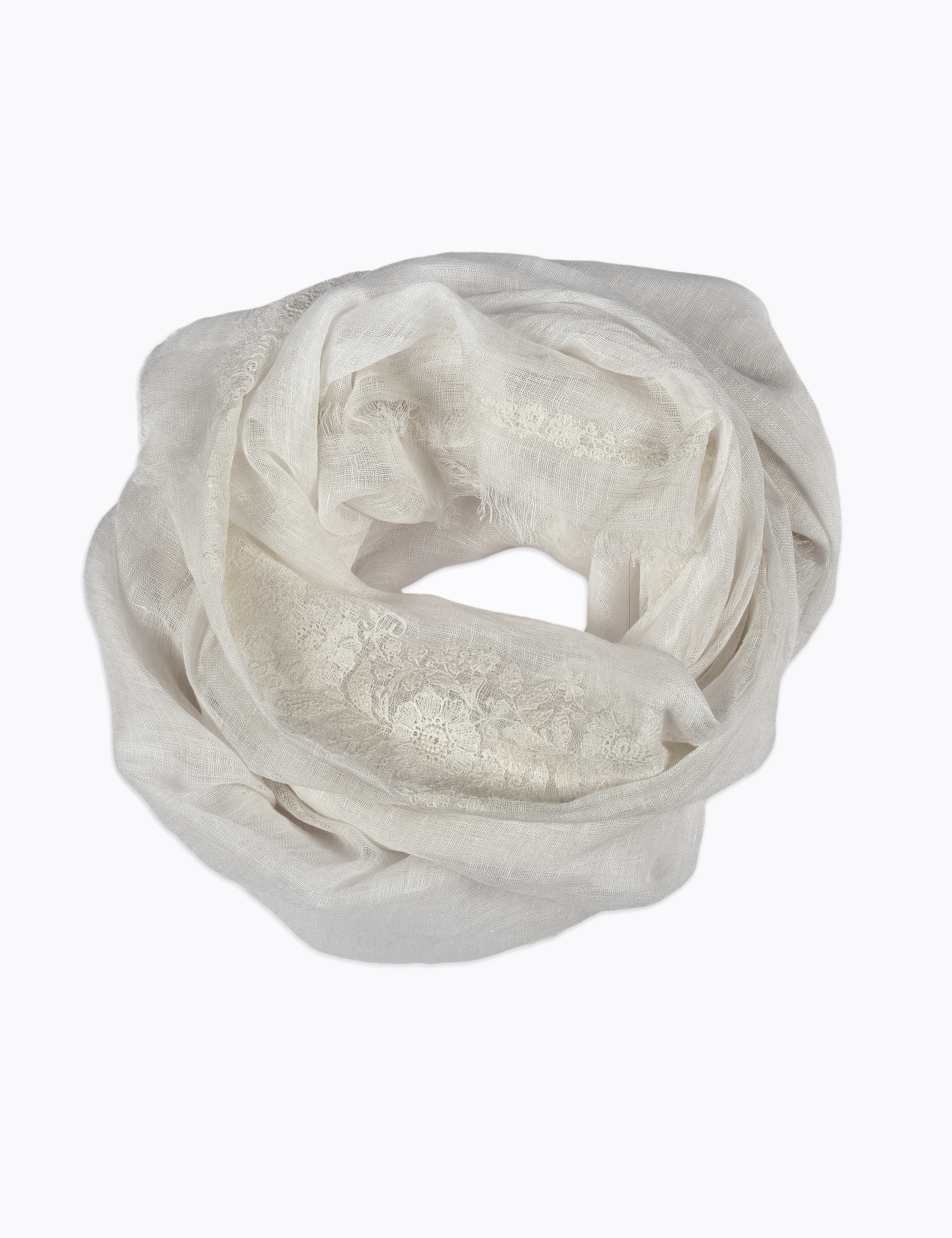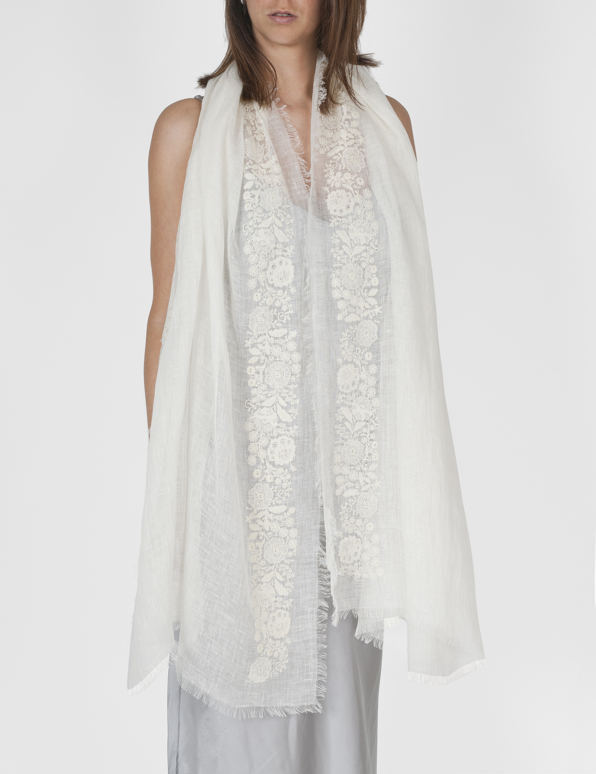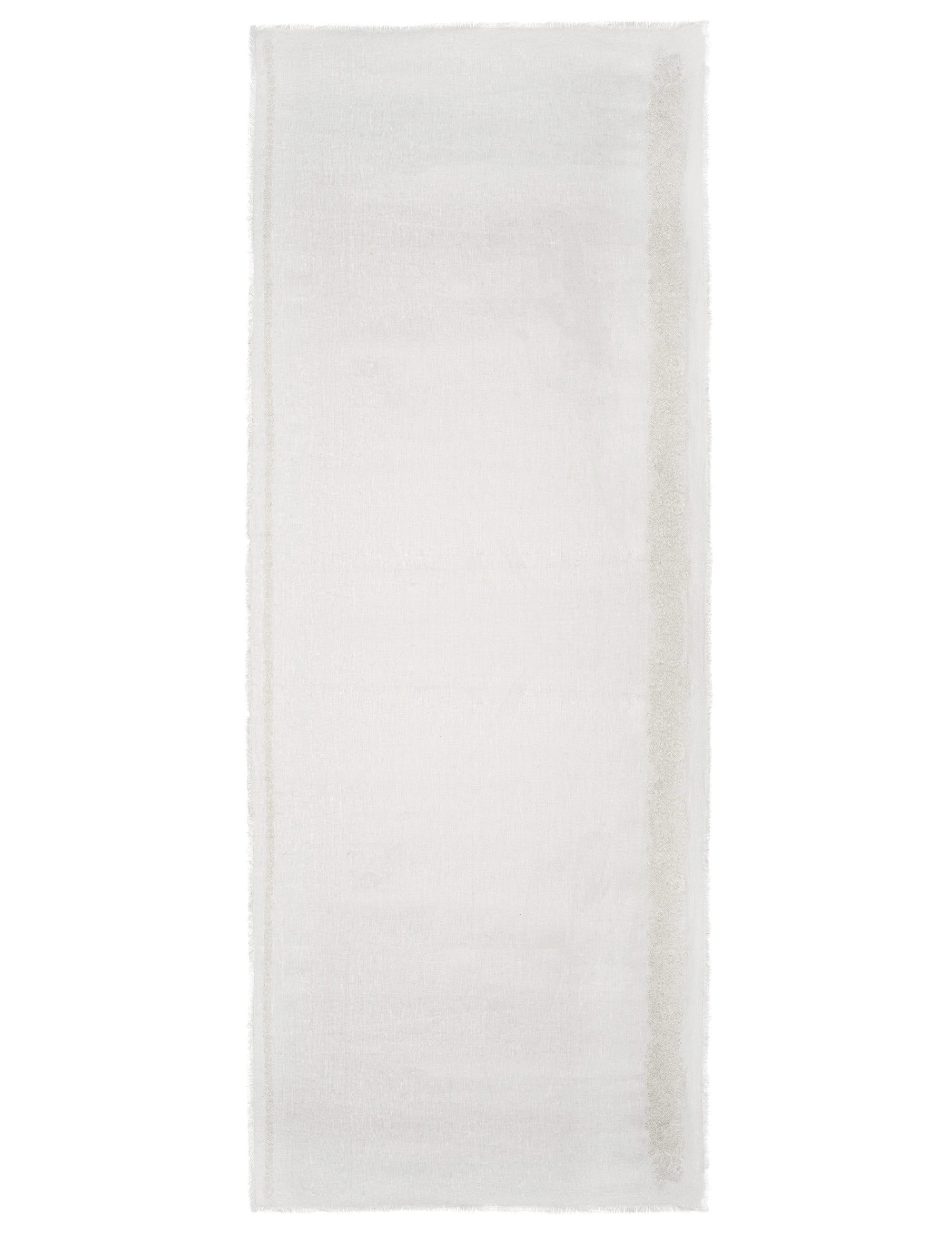 Light stole in solid colour, a linen gauze characterized by a lace embroidery of light and spring flowers in neutral tones.