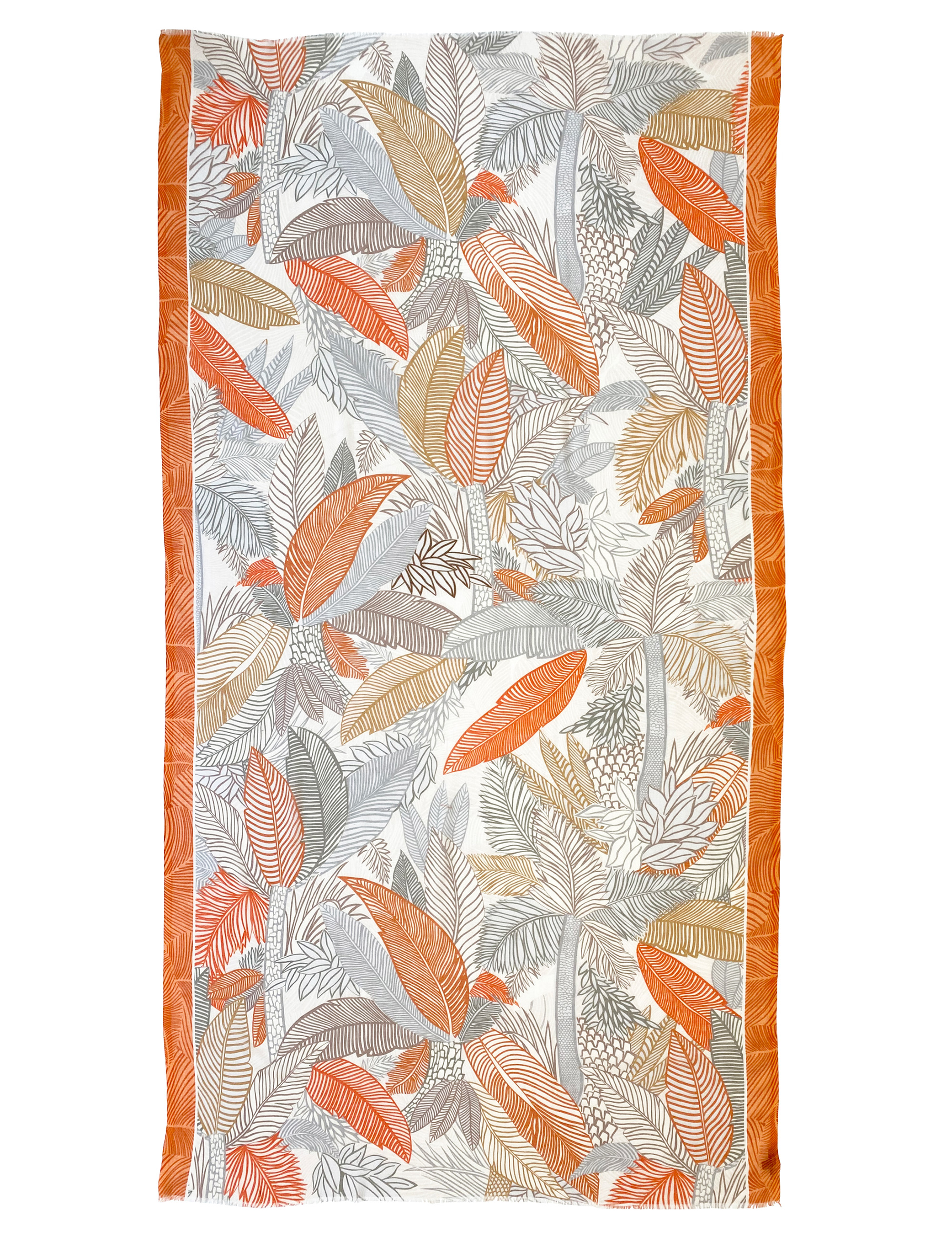 An enveloping and versatile stole tells of a tropical forest in shades of orange and sophisticated naturals.