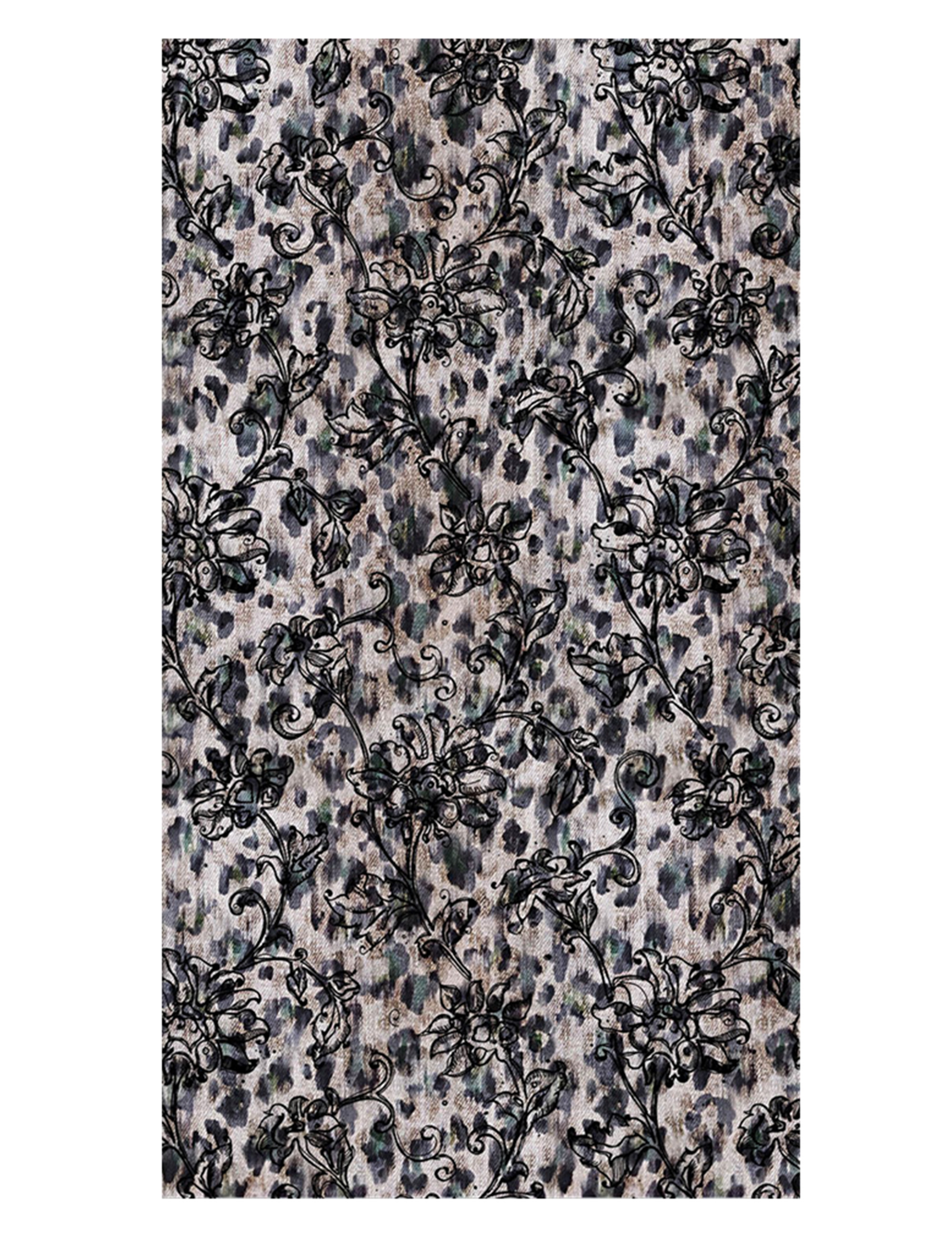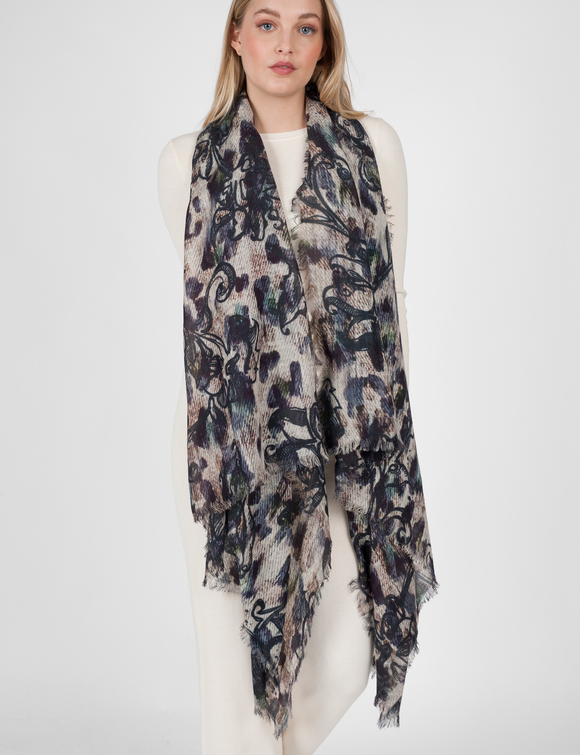 Large stole in pure wool characterized by an animal print overlaid by a light mono tone floral design.