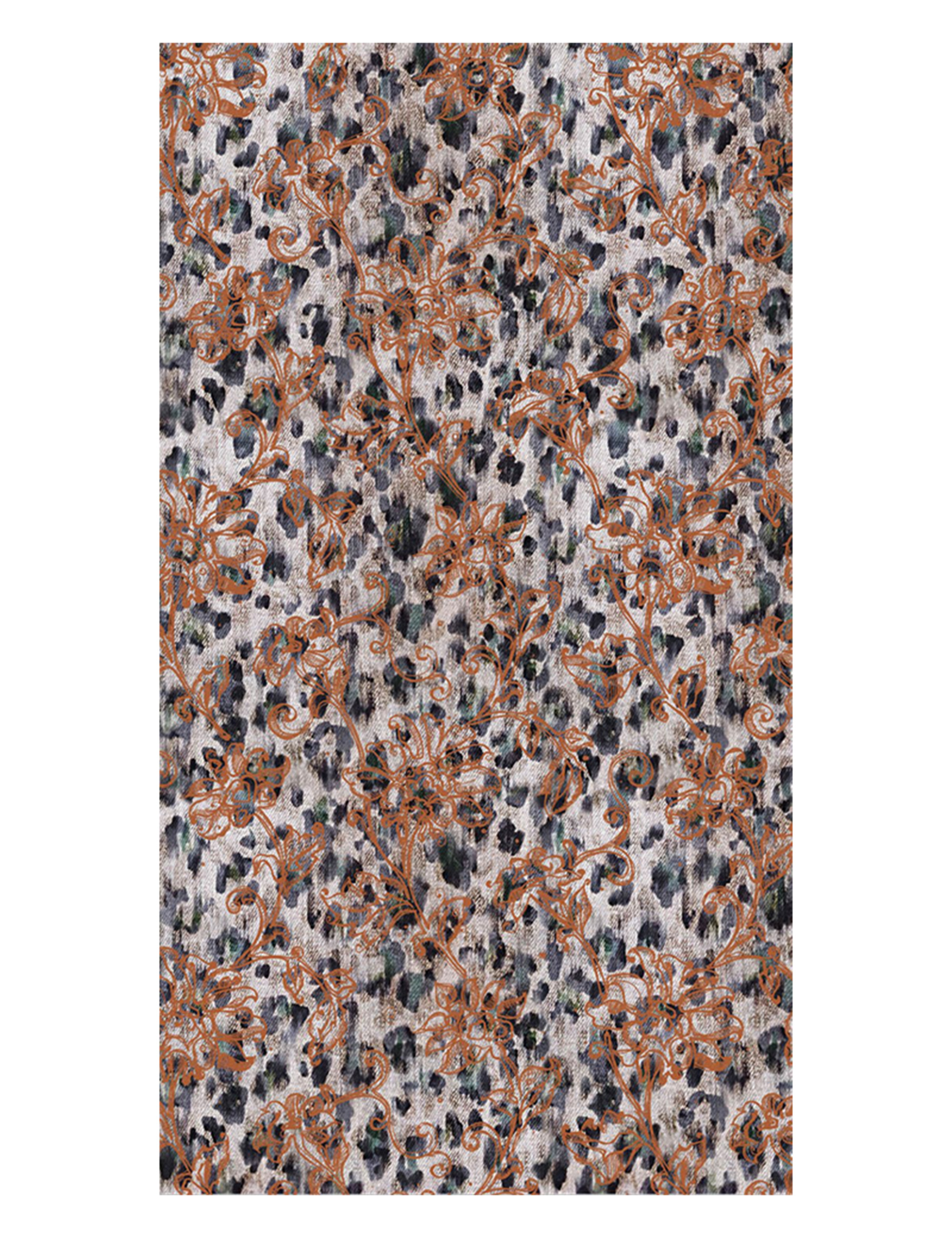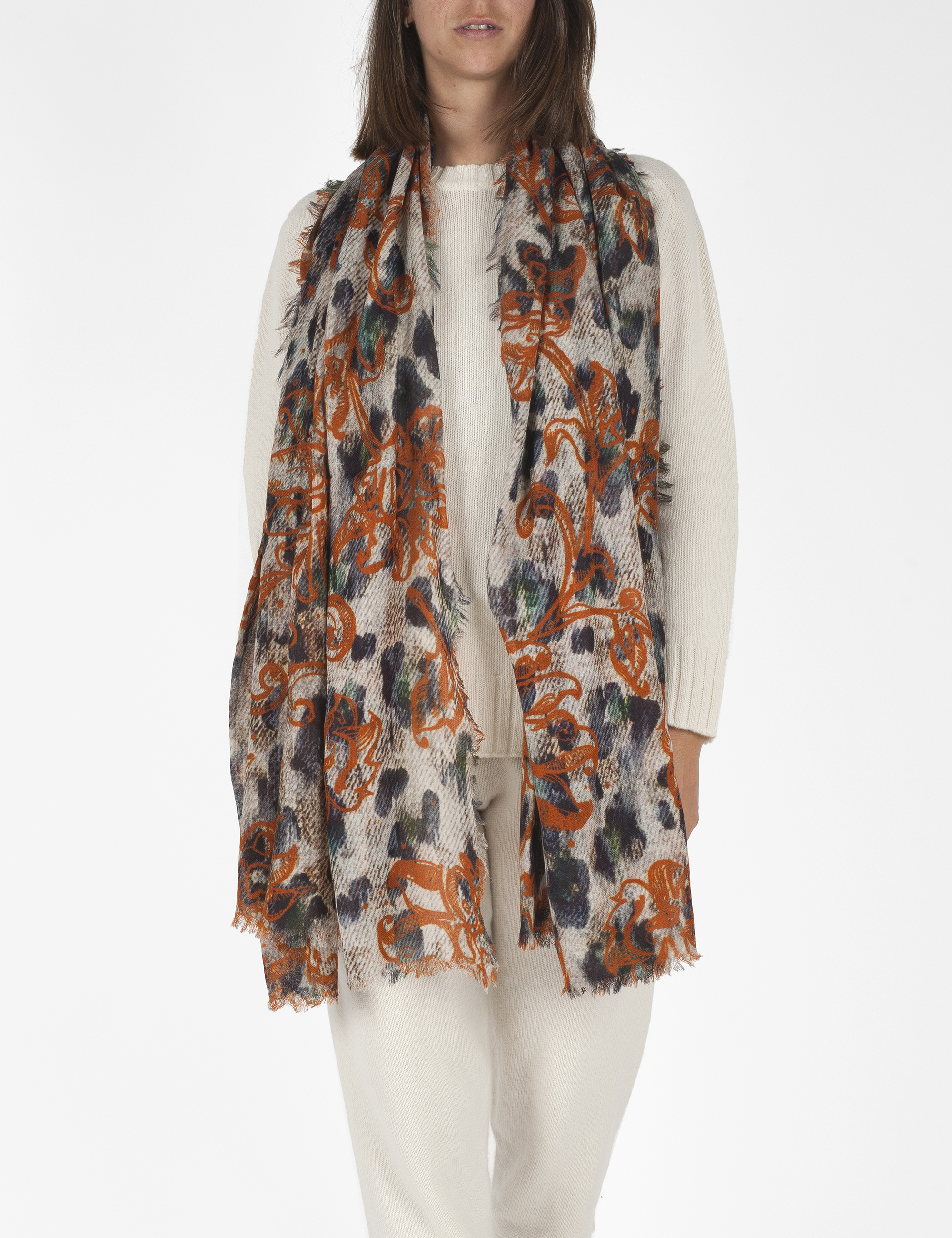 Large stole in pure wool characterized by an animal print overlaid by a light mono tone floral design.