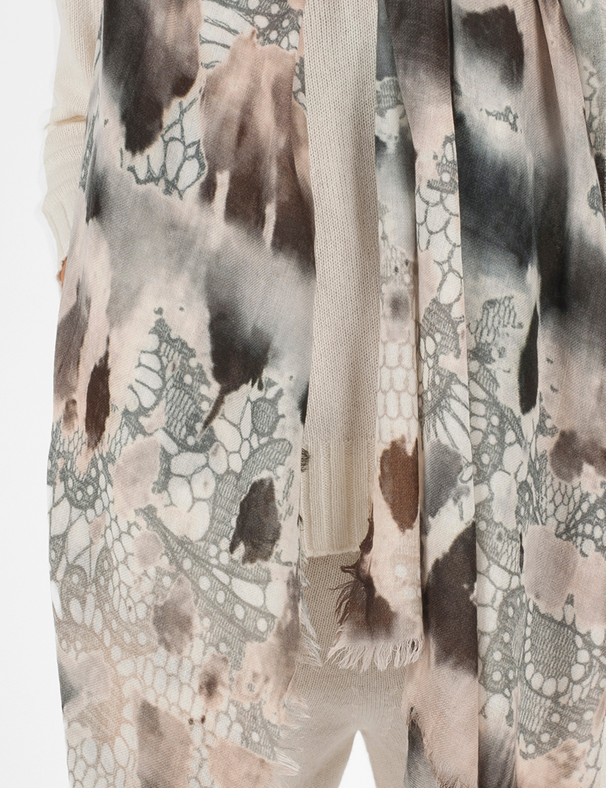 Large enveloping stole in pure wool, characterized by a multicolor lace base print overlaid by a tye dye design.
