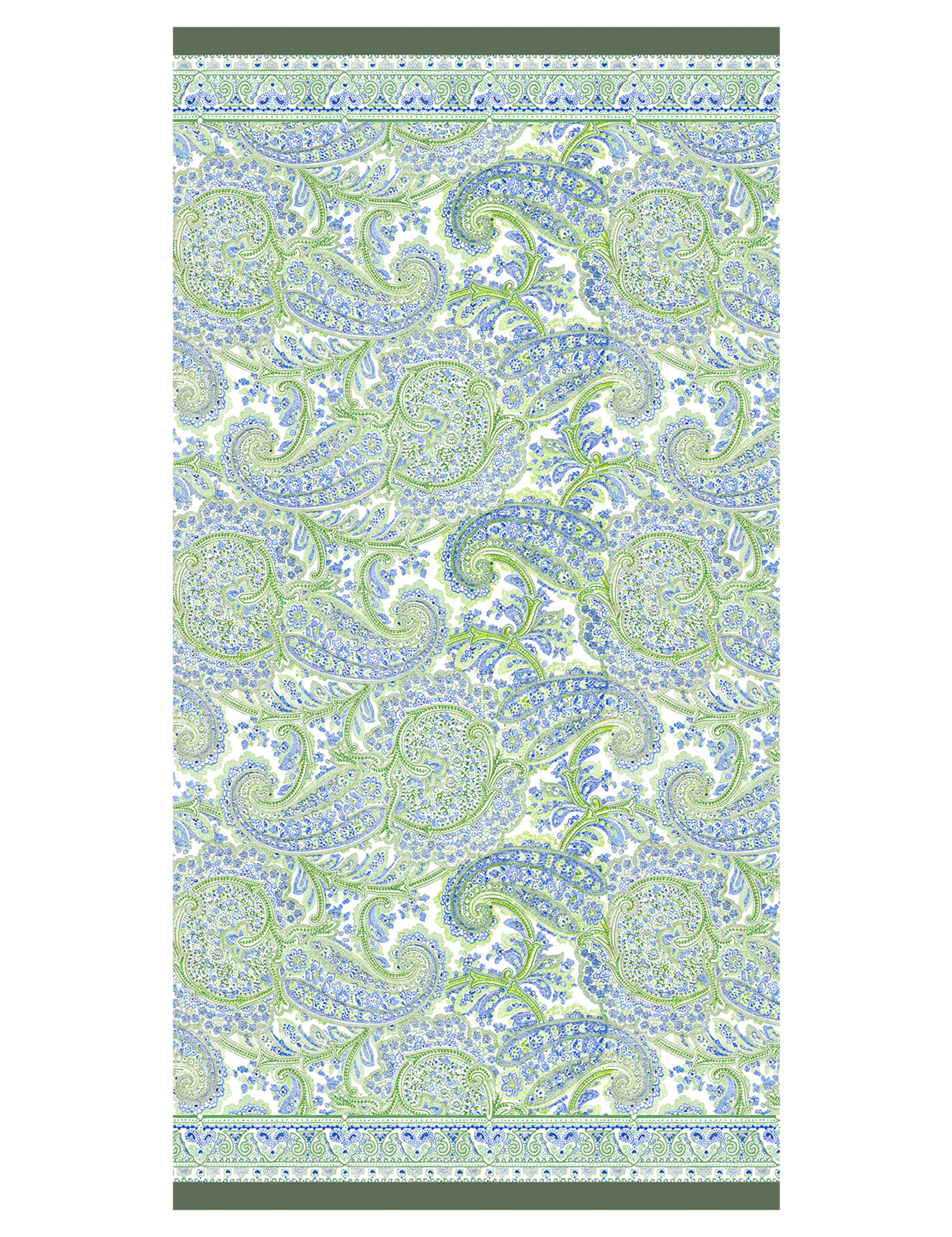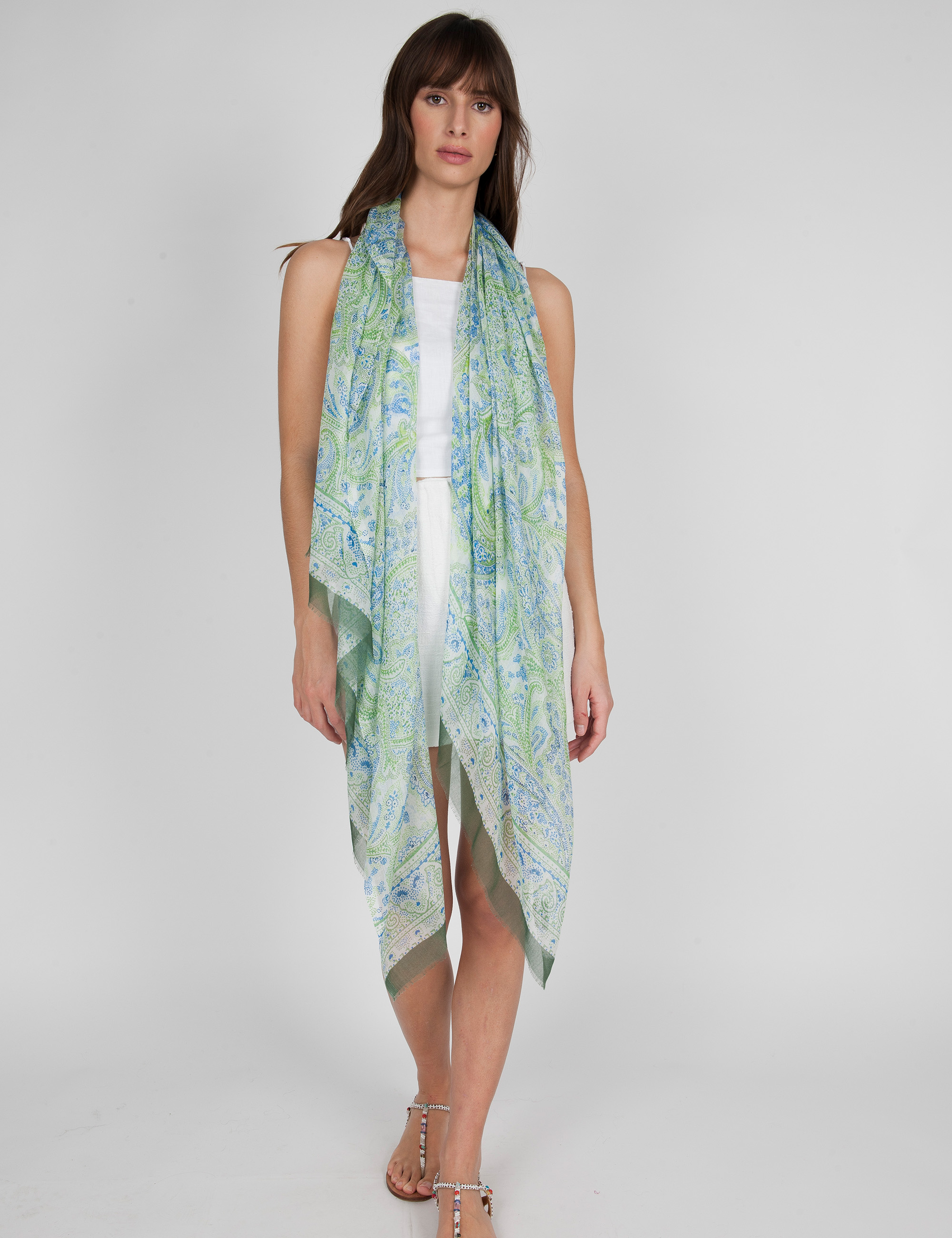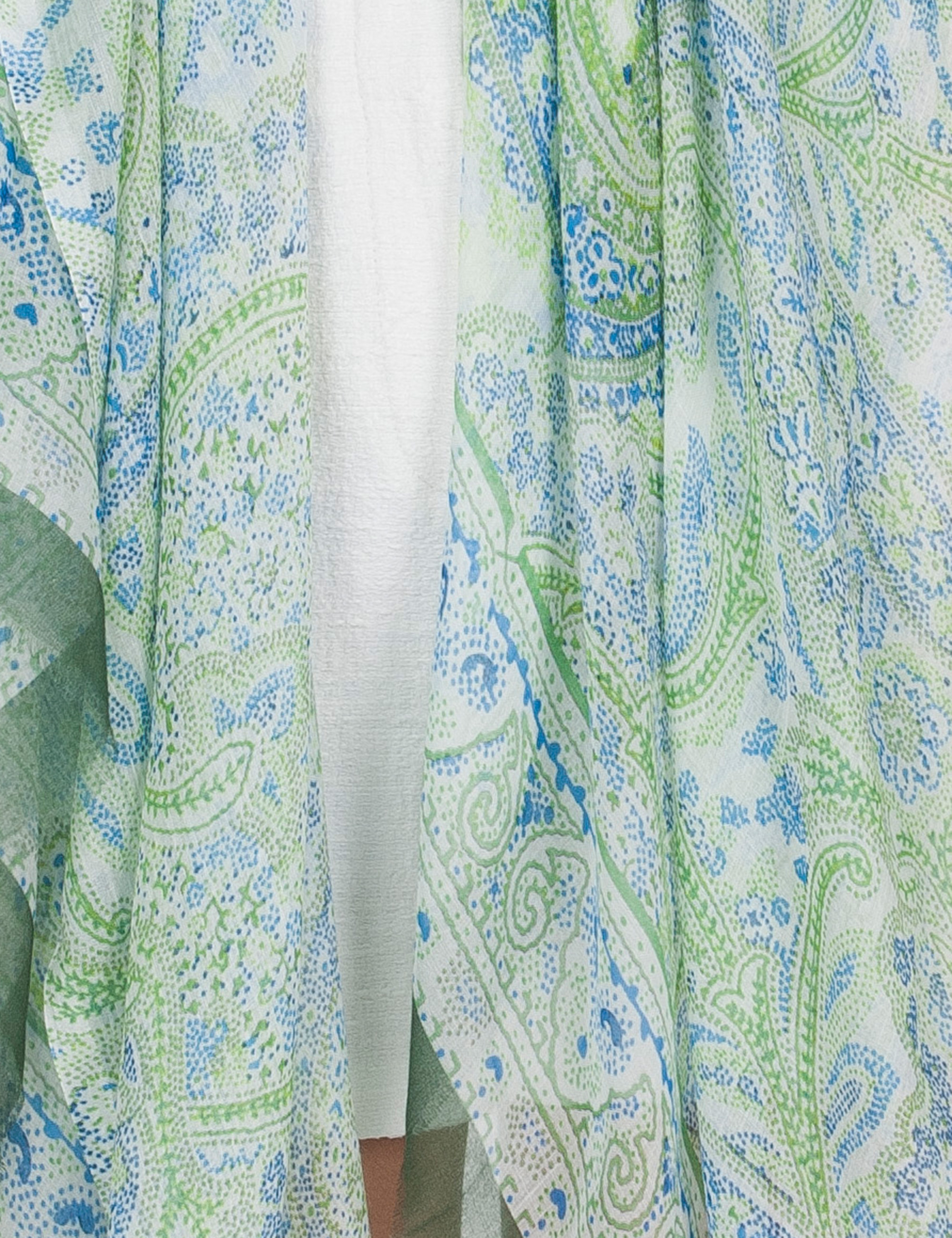 Soft modal and silk shawl with a macro paisley print in gradual shades of green and blue. An elegant and vibrant accessory that adds a touch of sophisticated and dynamic color to any look.