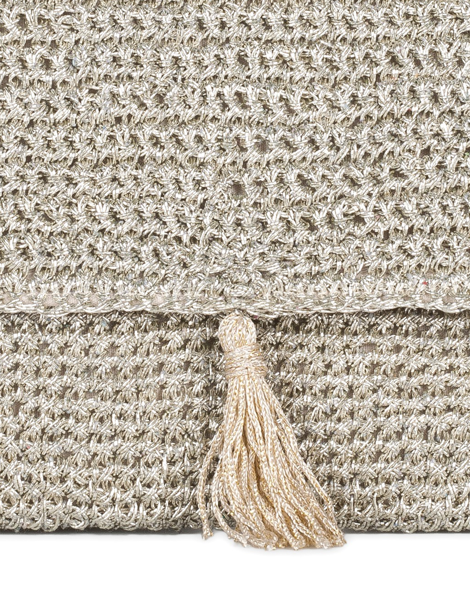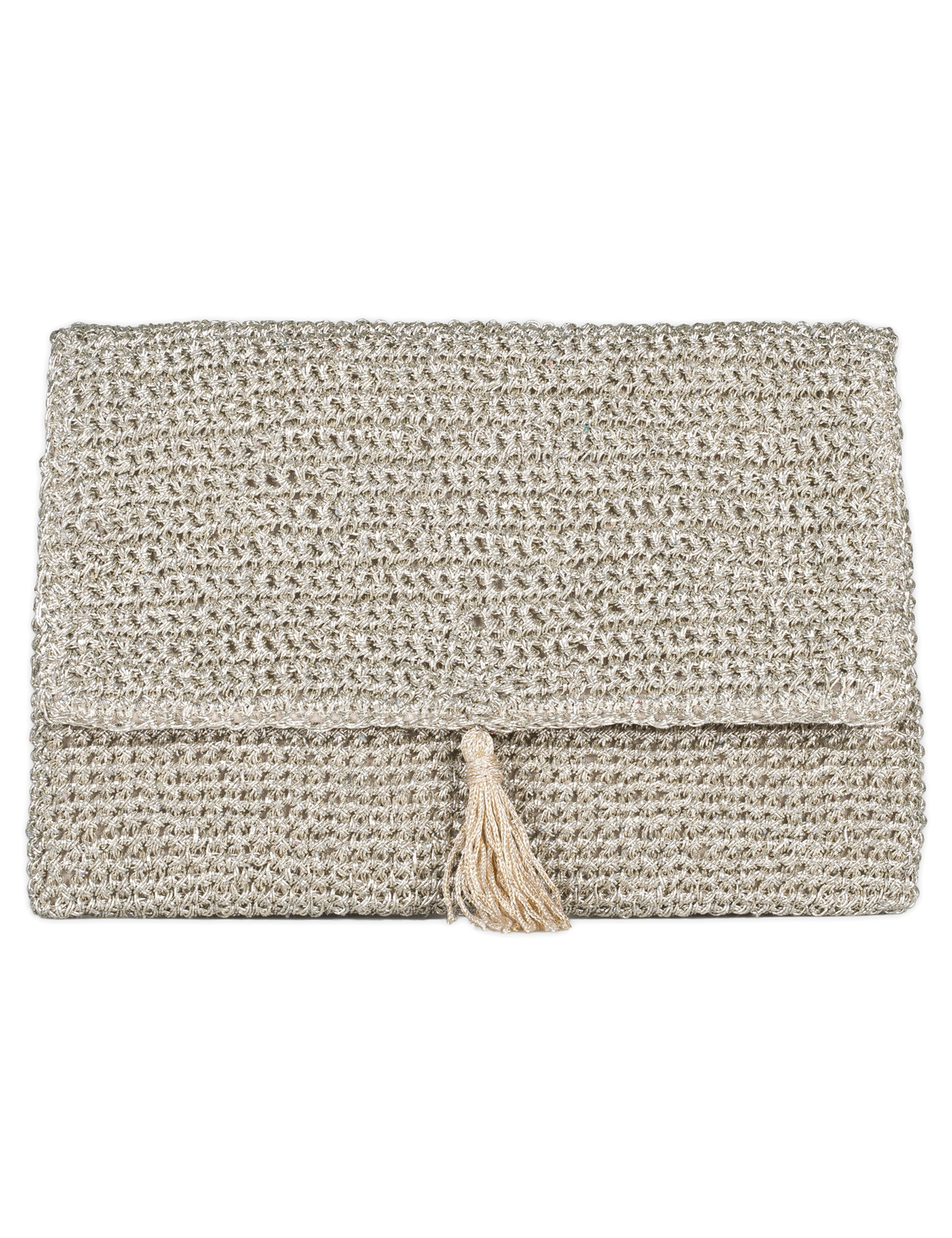 Golden clutch in woven metallic thread, luminous and sophisticated. The artisanal texture adds character, while the sleek design with a flap and tassel brings a glamorous touch. Featuring a delicate chain inside, it can also be worn as a shoulder bag. Perfect for completing elegant and refined looks.