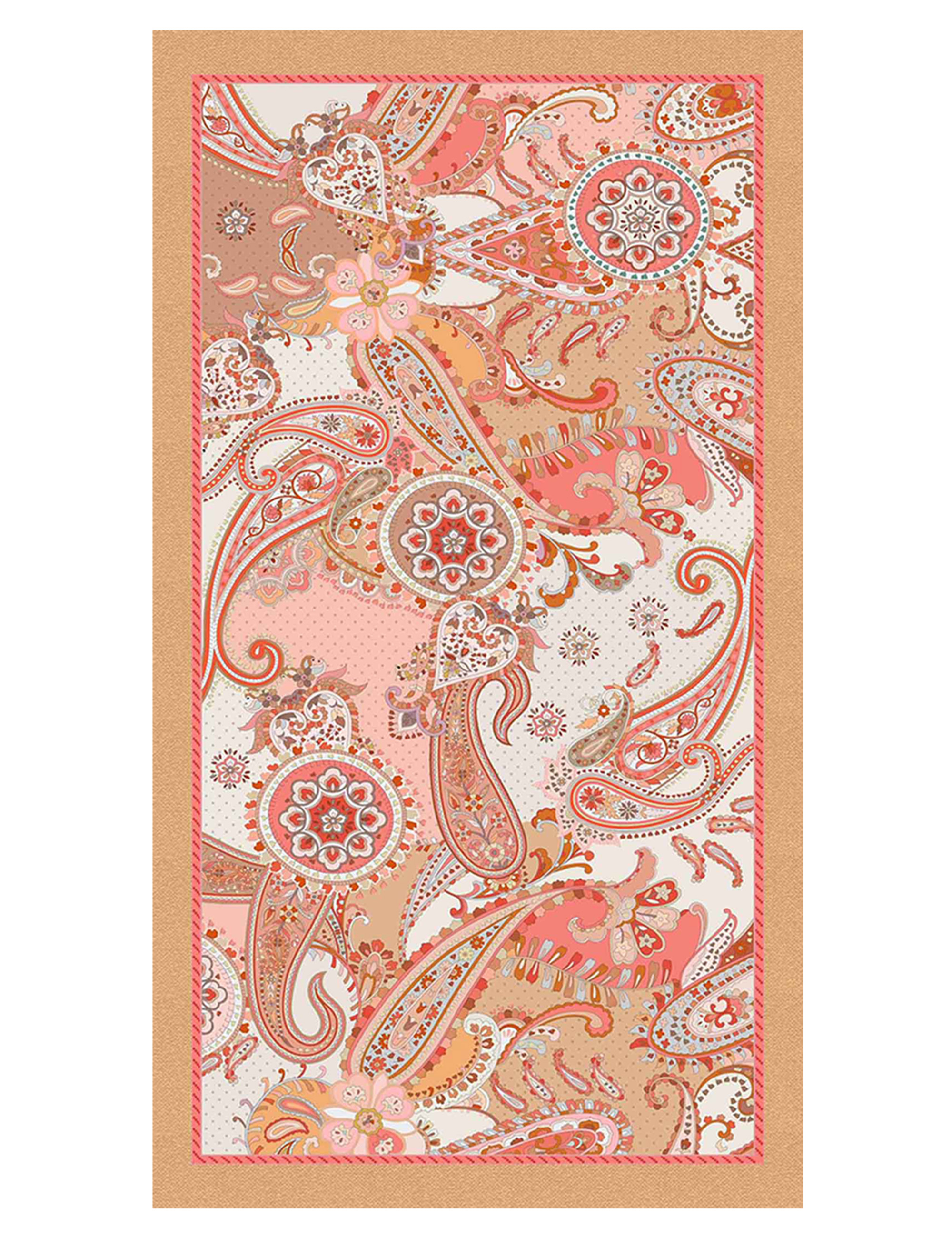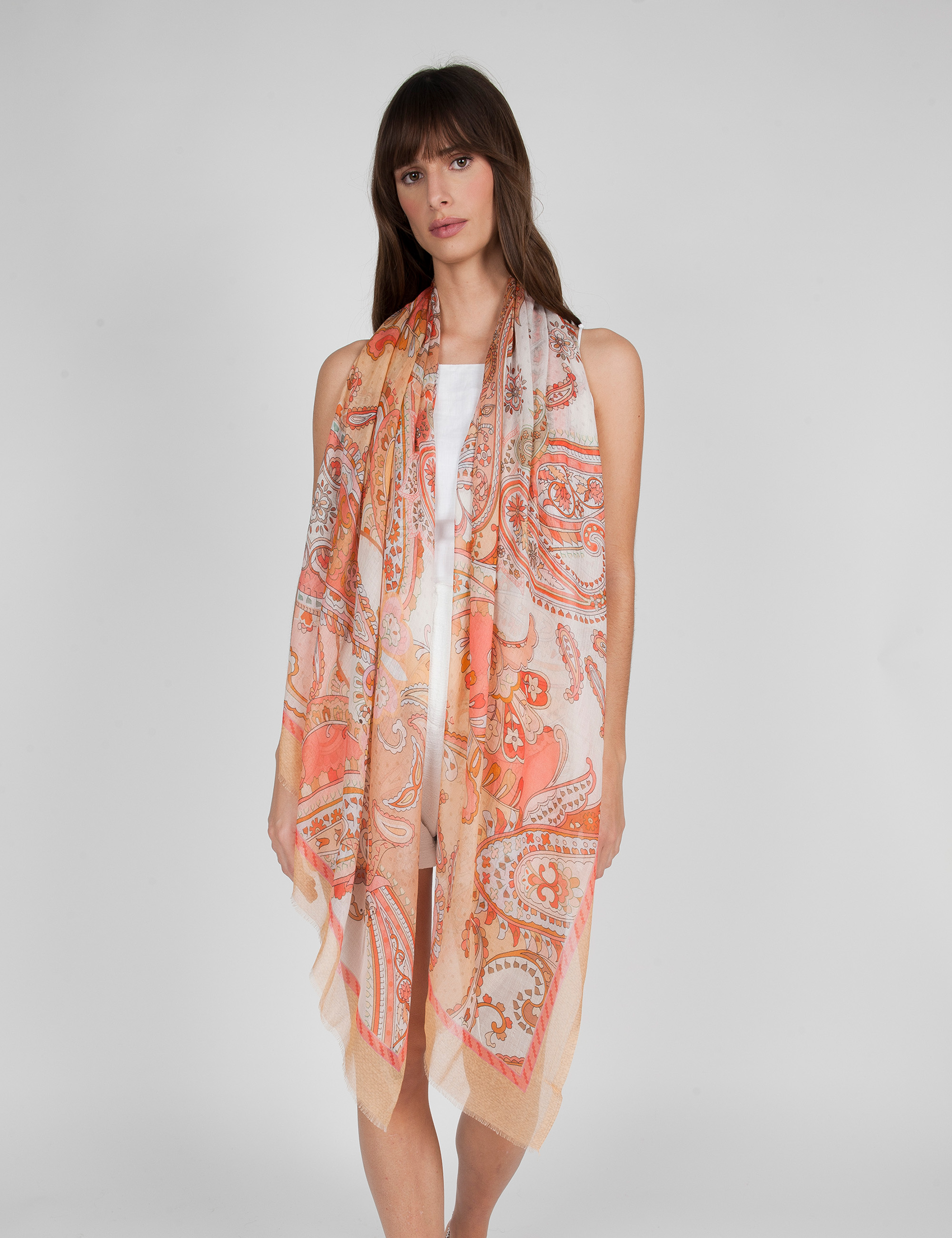 Large modal and silk shawl with a vibrant paisley print in shades of peach, elegantly framed by a defined border. A sophisticated and colorful accessory that adds a touch of style and refinement to any outfit.