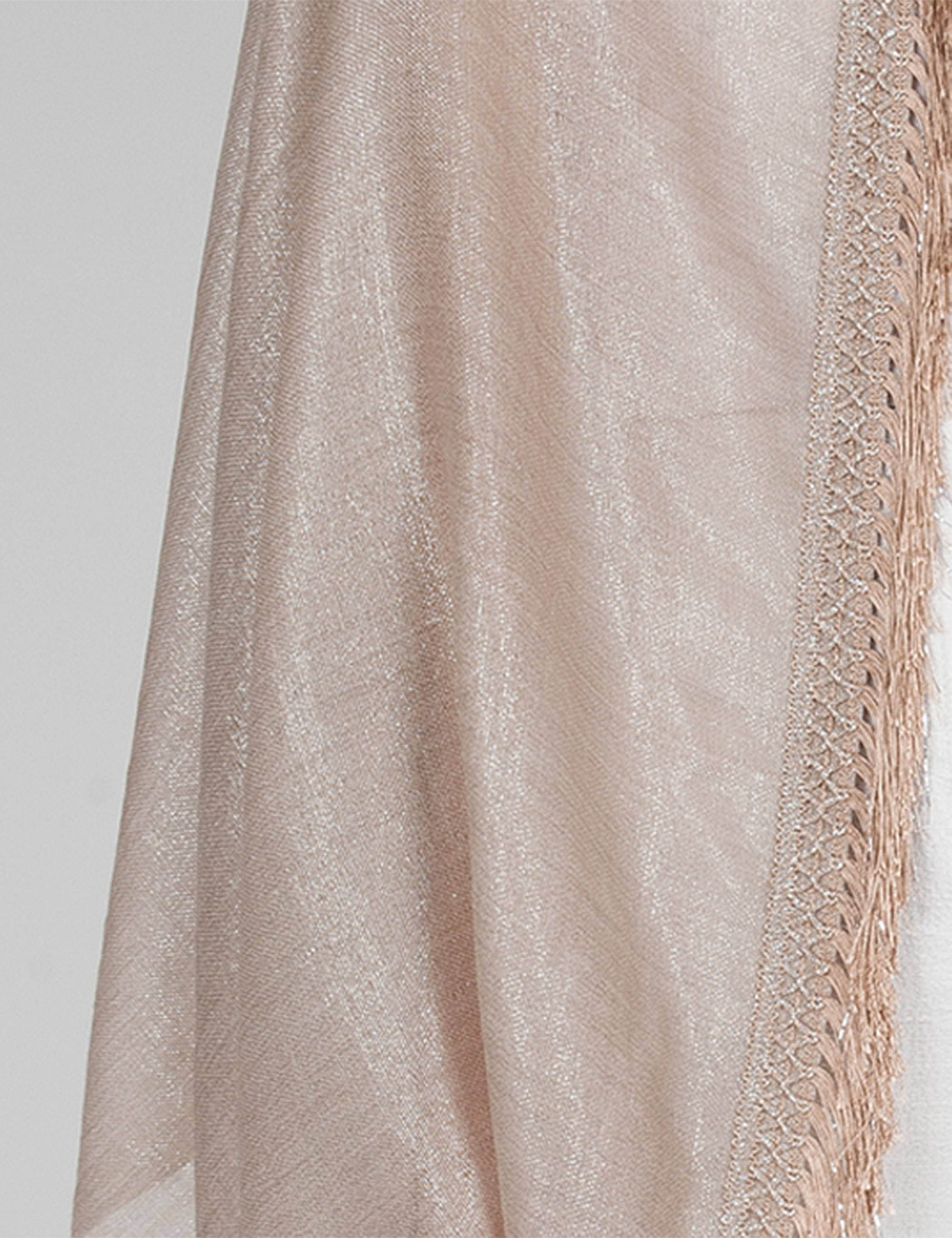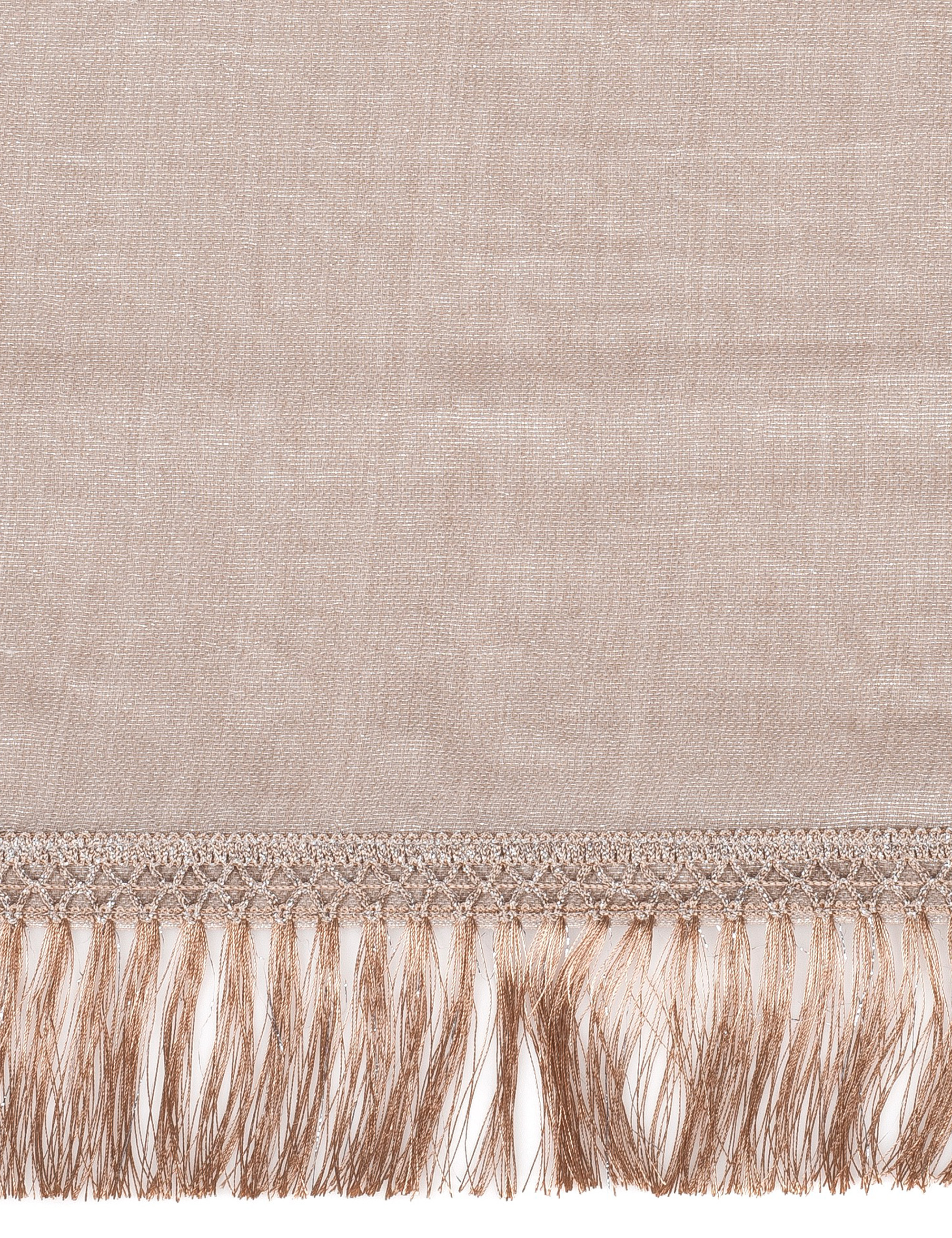 Cotton and wool shawl enriched with elegant lurex inserts that add light and refinement to the piece. The fringes, tone-on-tone, are delicately crafted with tonal lurex threads, creating a sophisticated game of lights. A chic accessory, perfect for adding a touch of glamour to any look, both day and night.