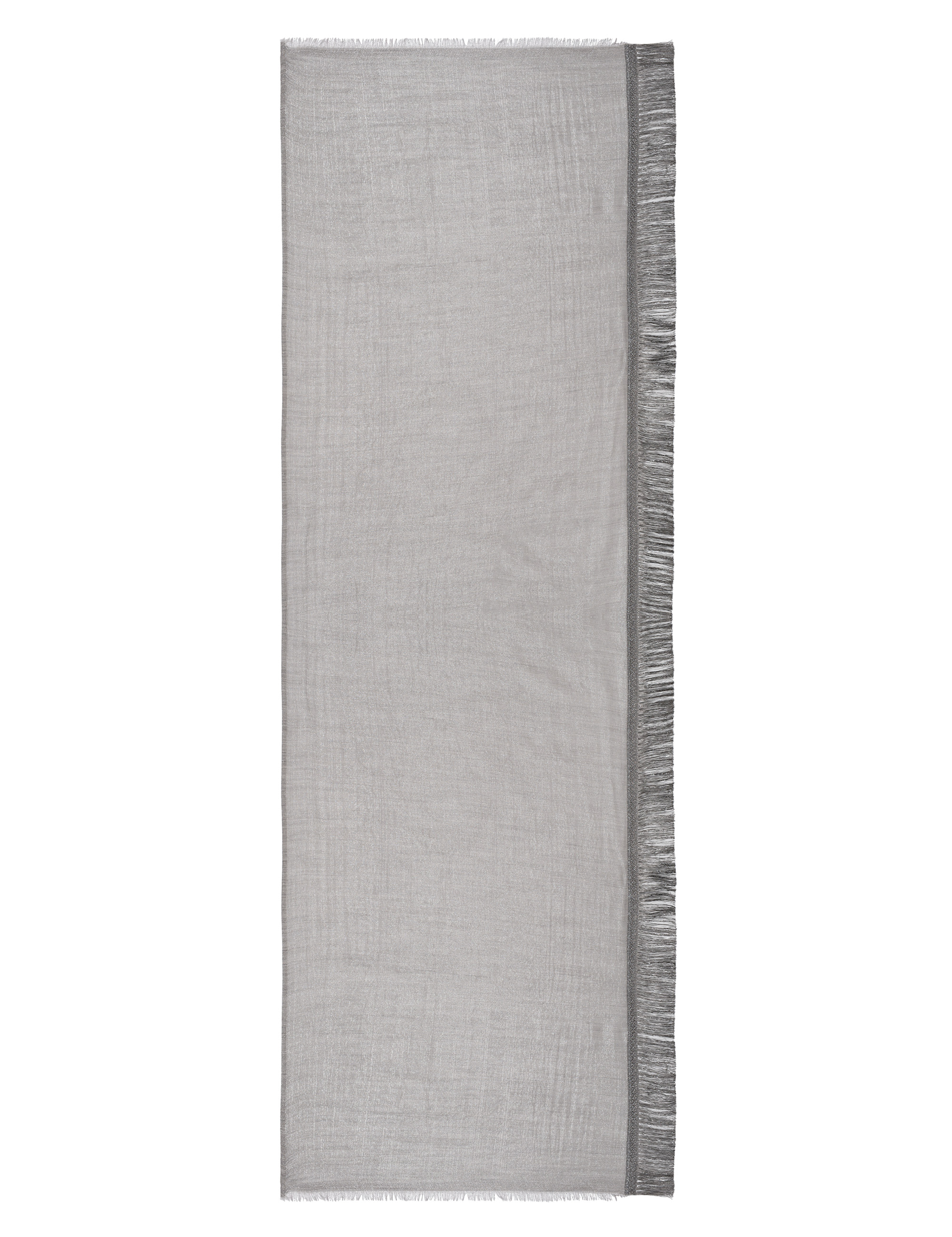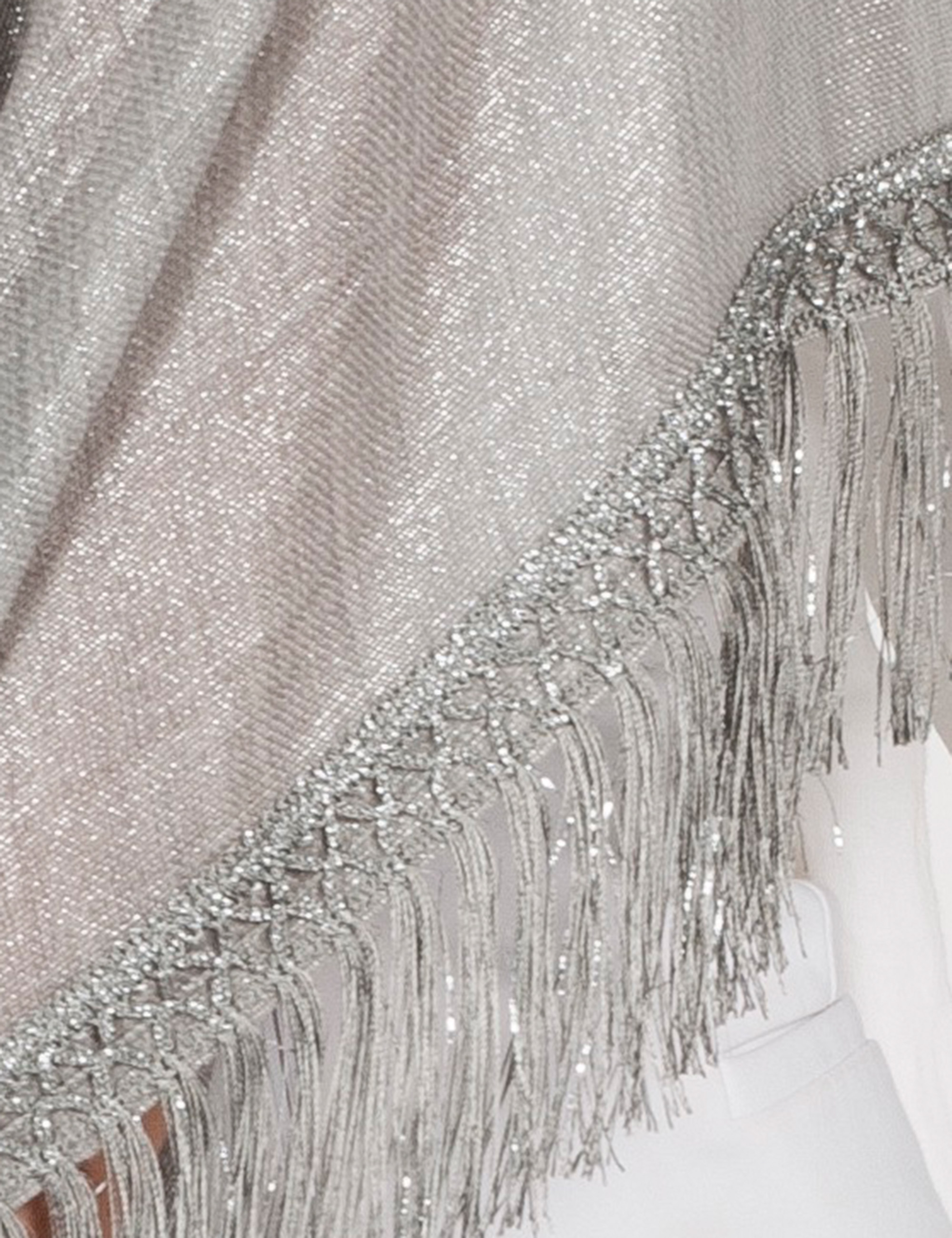 Cotton and wool shawl enriched with elegant lurex inserts that add light and refinement to the piece. The fringes, tone-on-tone, are delicately crafted with tonal lurex threads, creating a sophisticated game of lights. A chic accessory, perfect for adding a touch of glamour to any look, both day and night.