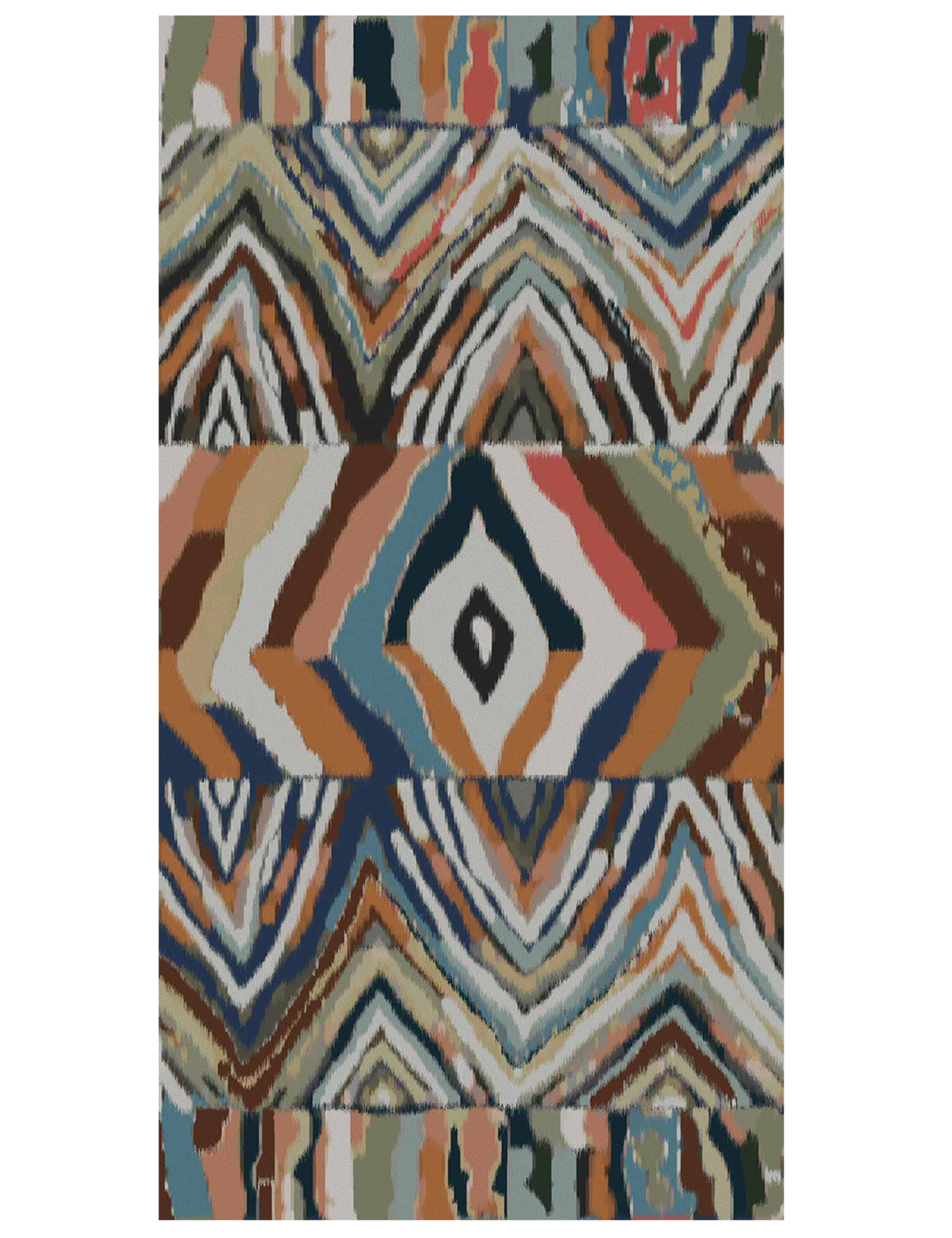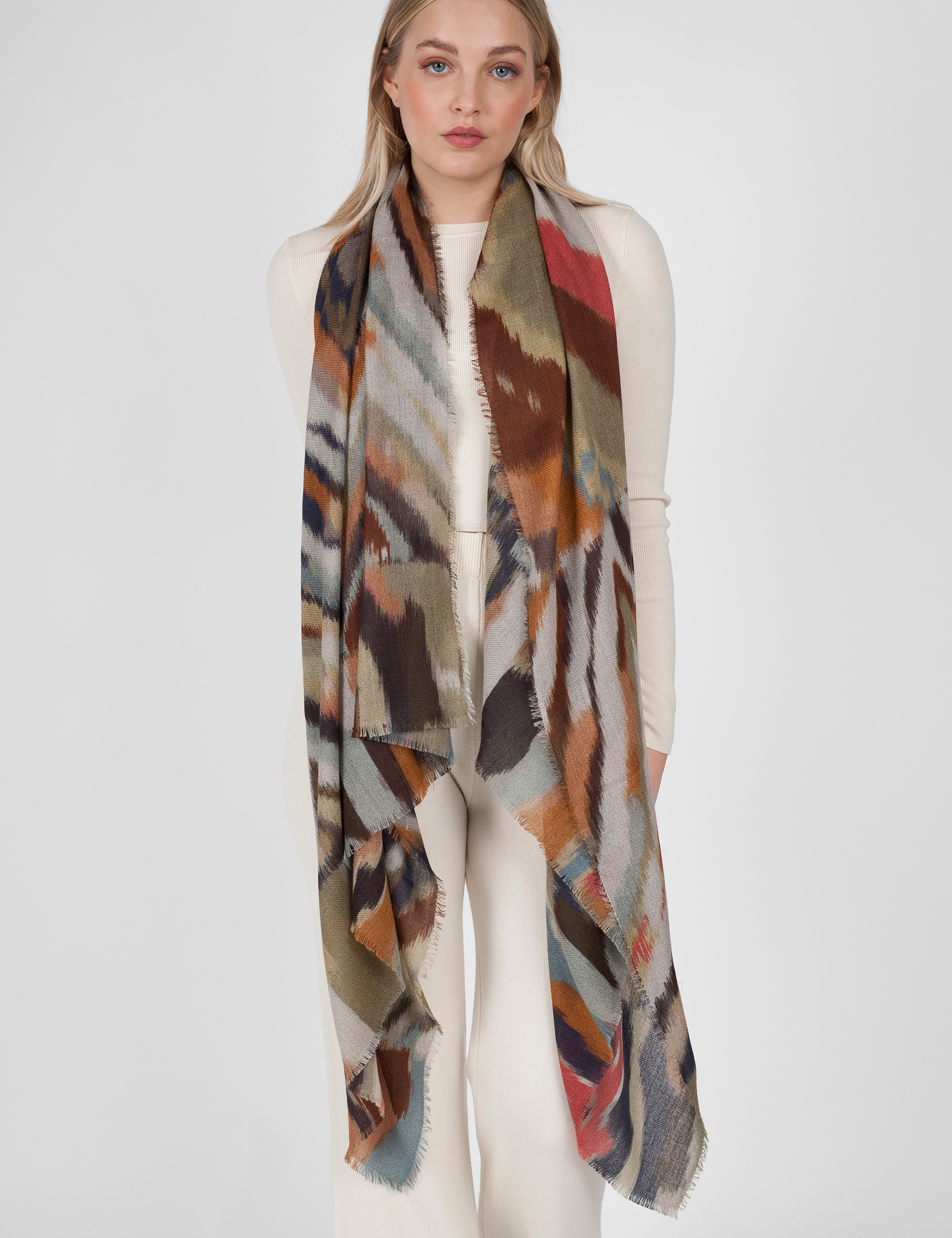 Sofisticata e morbida stola realizzata in lana misto modal, caratterizzata da una stampa gemoetrica acquarellata sui toni del jeans e naturali. Bordata da una microfrangia sui quattro lati.