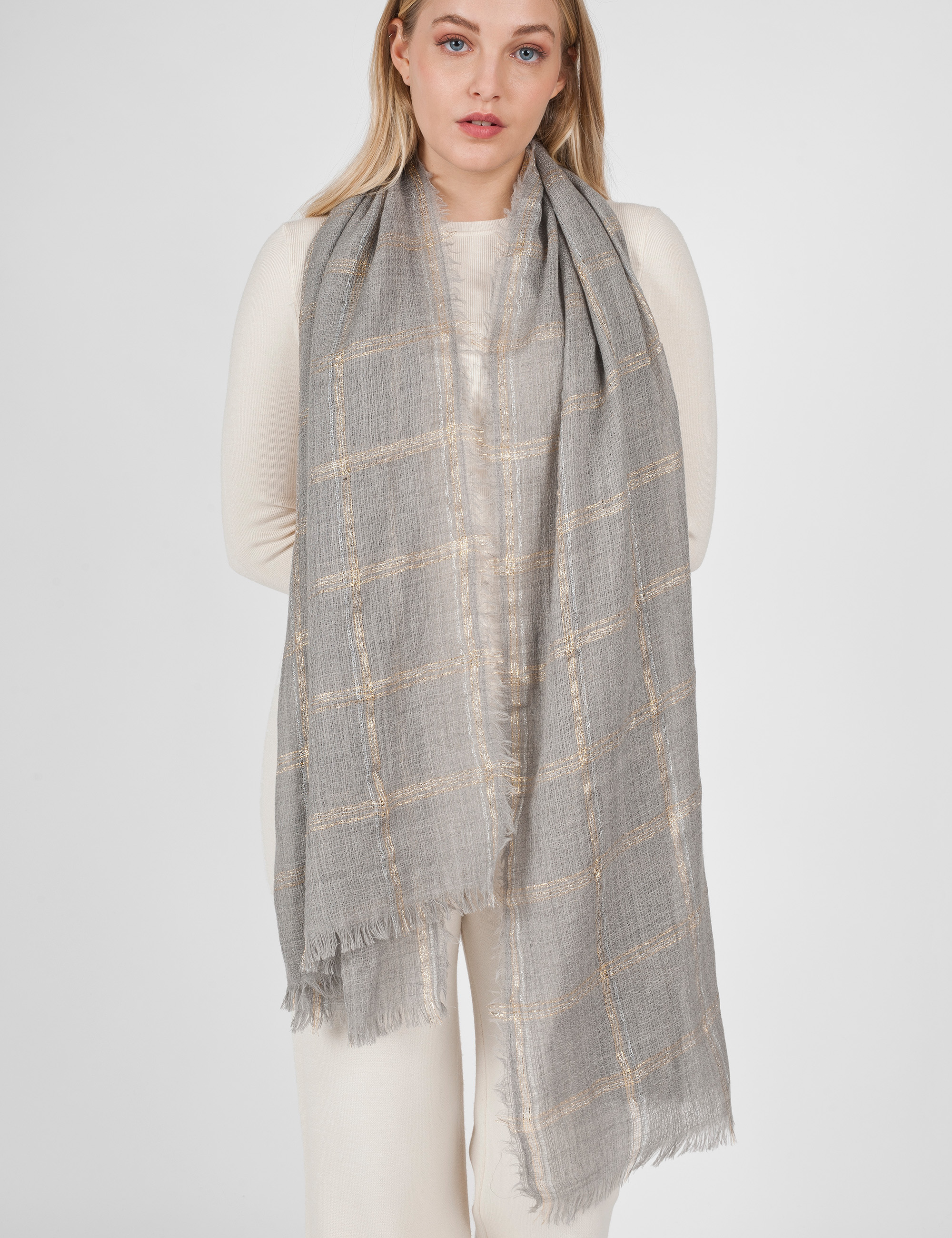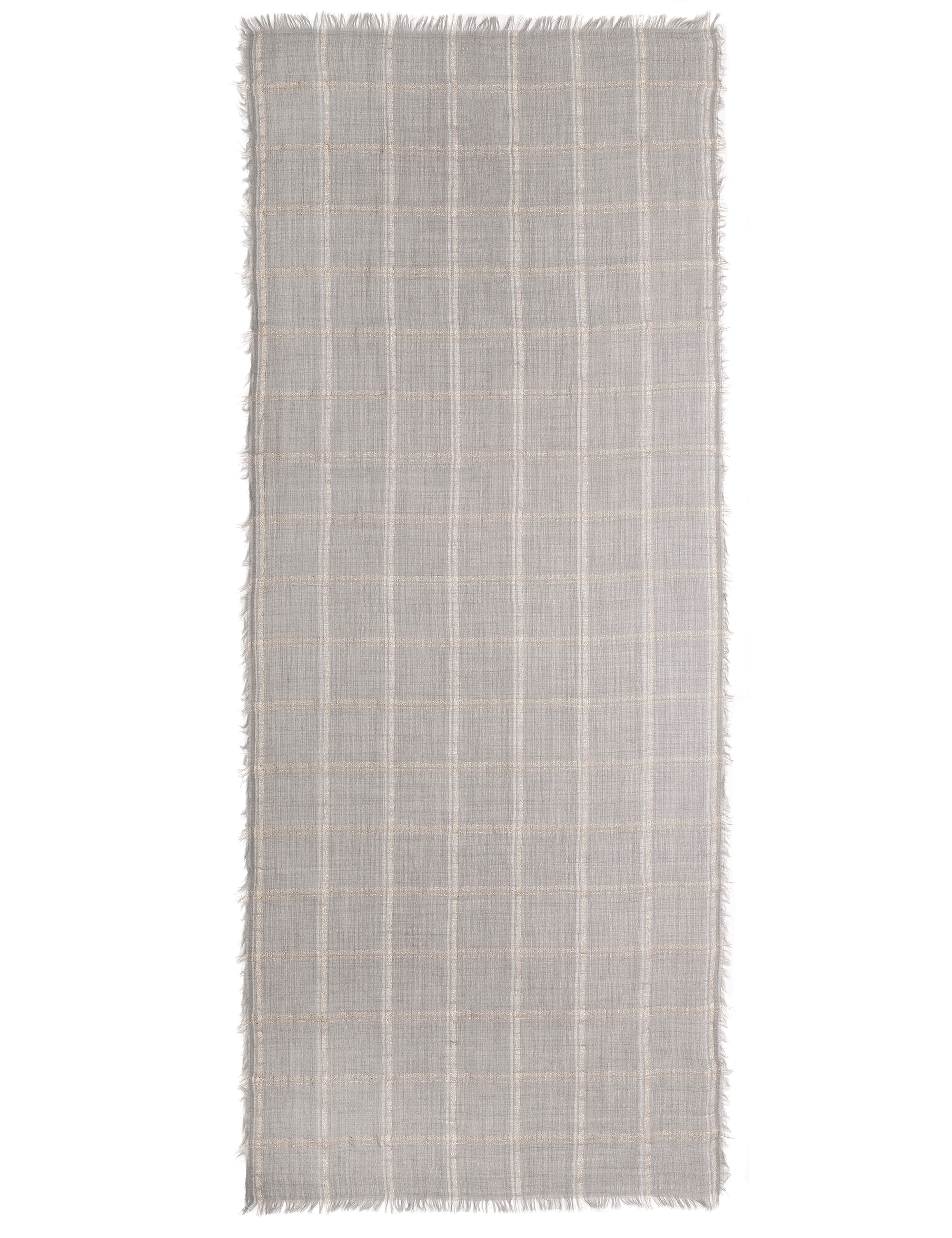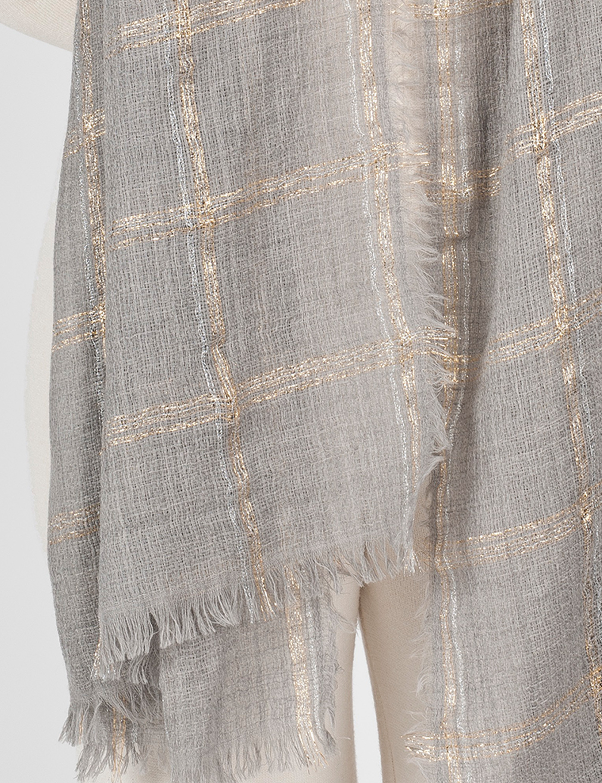 Sofisticata stola in lana realizzata in tinto filo ed impreziosita da un disegno check combinato da un mix di fili metallizzati oro ed argento. Microfrange sui quattro lati completano il look.