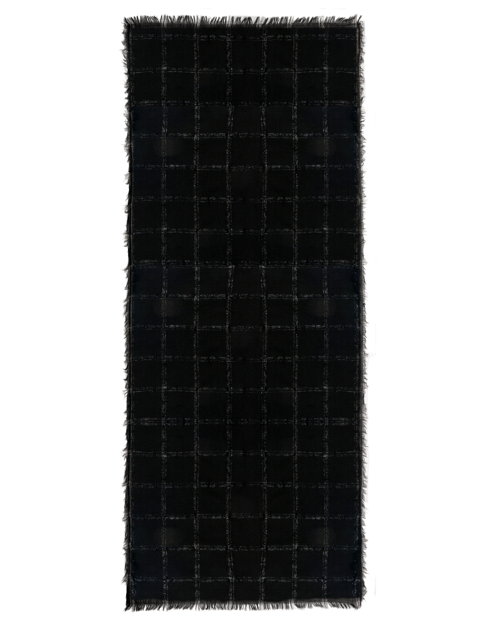 Sofisticata stola in lana realizzata in tinto filo ed impreziosita da un disegno check combinato da un mix di fili metallizzati . Microfrange sui quattro lati completano il look.