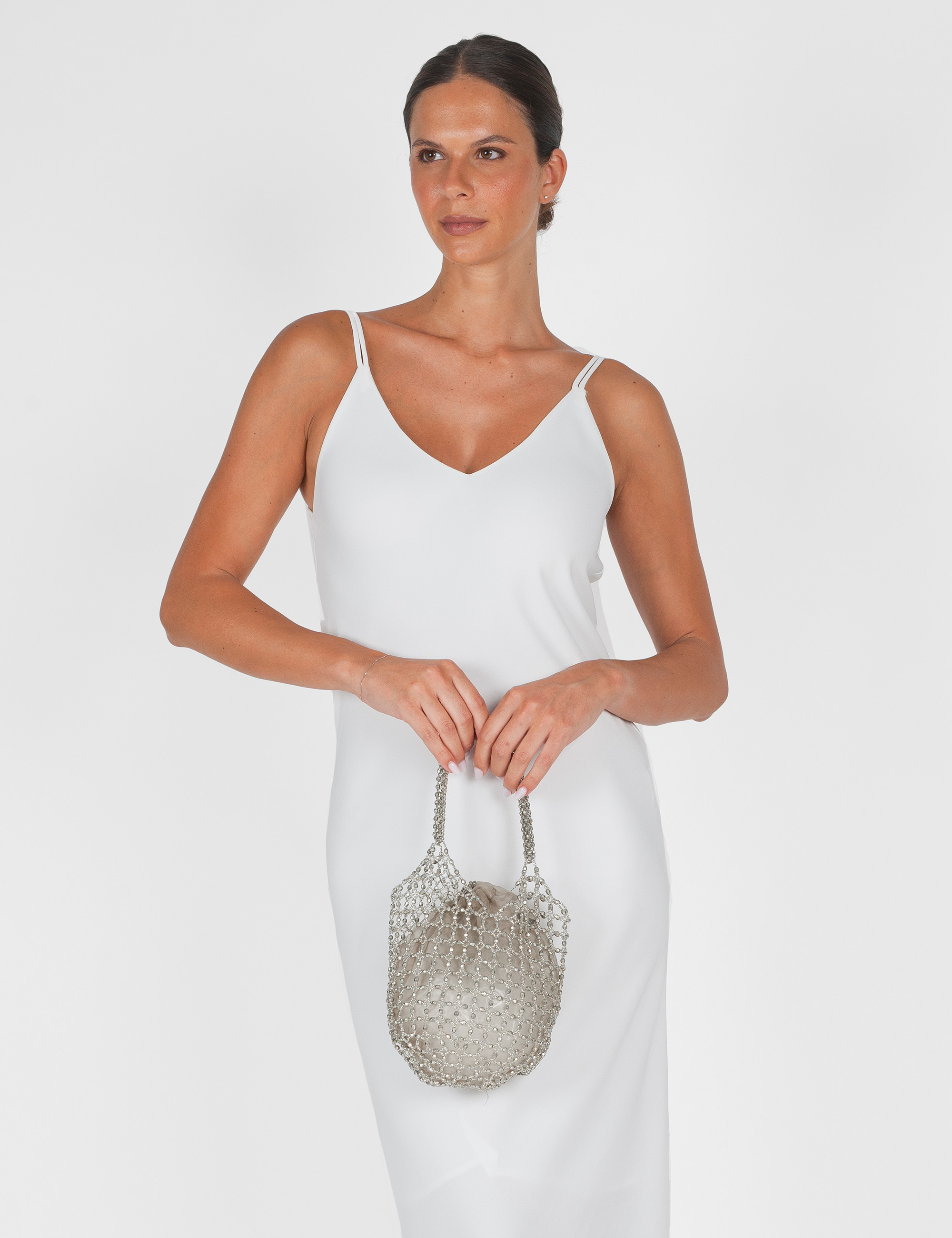 Colore argento luminoso, con struttura morbida e design essenziale.