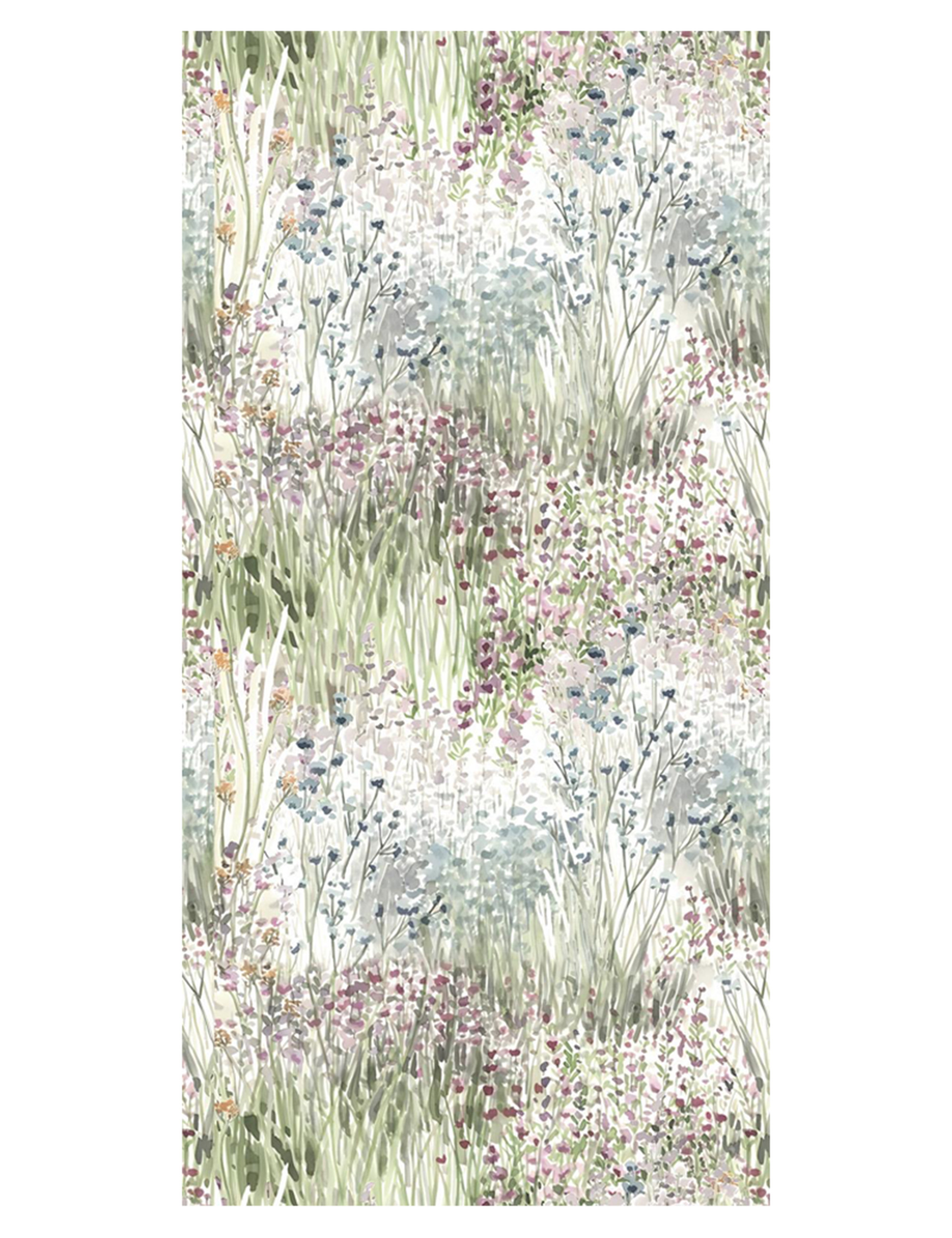 Stampa floreale acquarellata multicolore nei toni del verde salvia, rosa cipria e avorio, con sfumature morbide e trasparenze luminose.