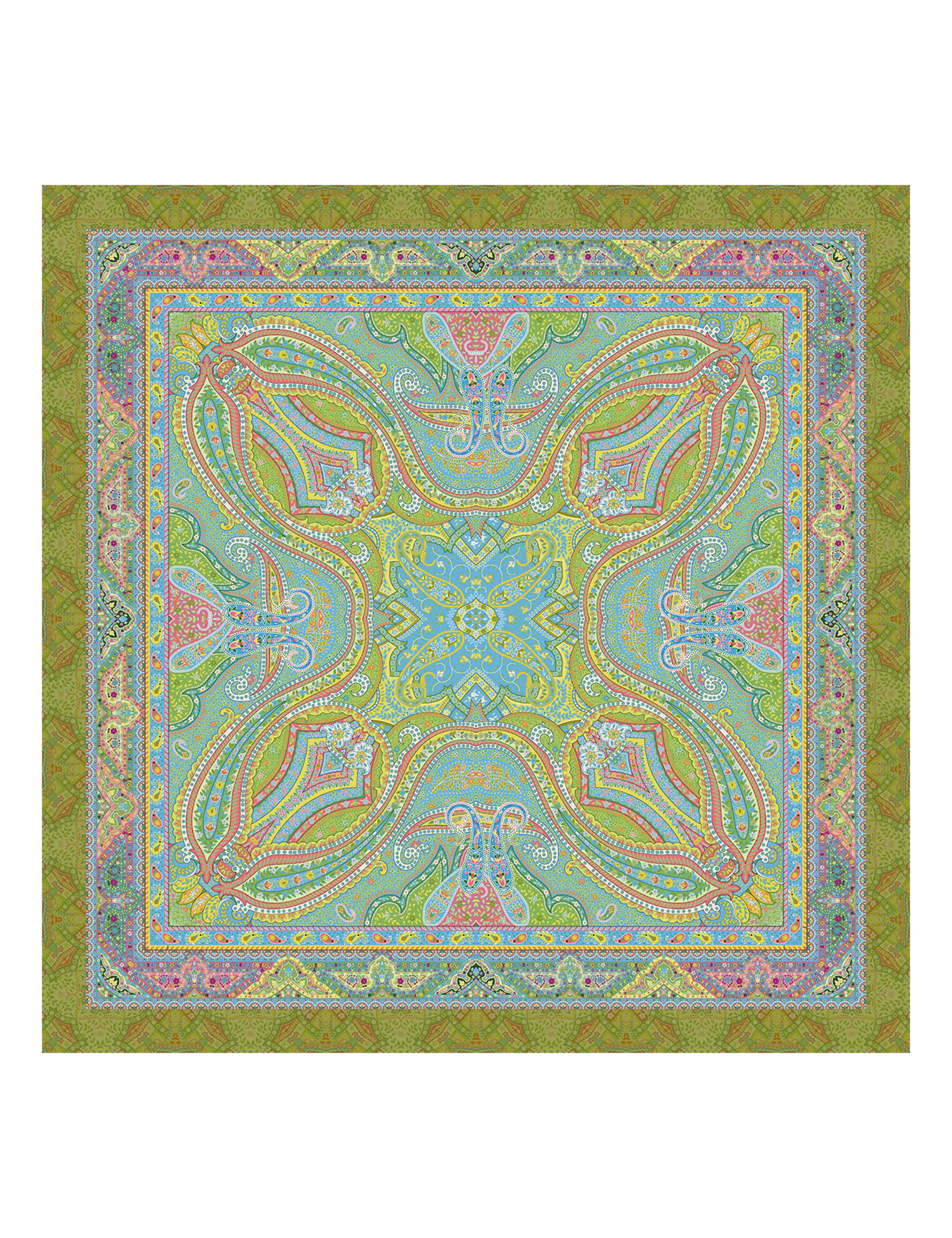 Multicolored paisley pattern in shades of lime green, turquoise, and pink, rich in graphic details and luminous contrasts.