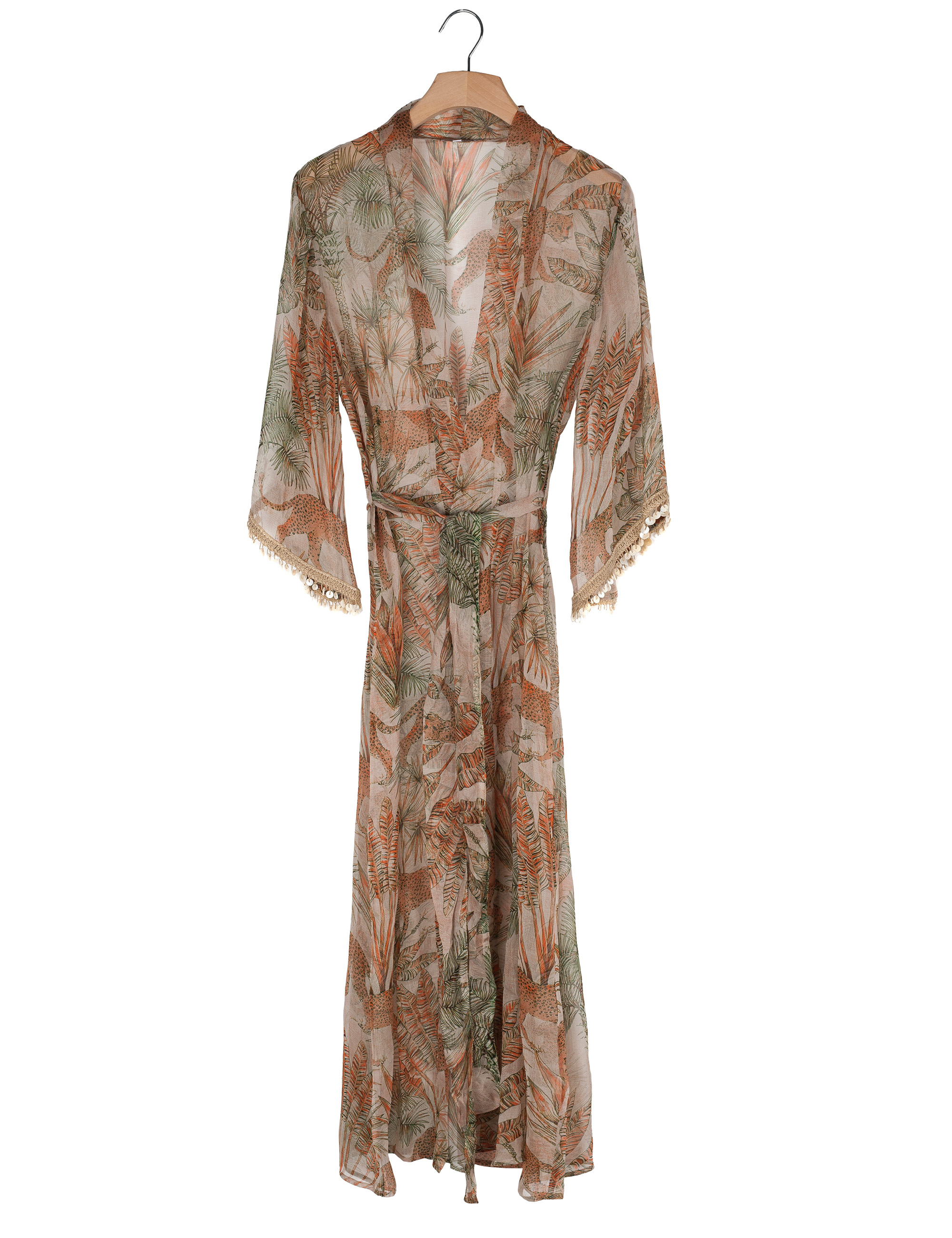 Kimono lungo in tessuto leggero e semitrasparente, con stampa tropicale dai toni naturali e delicati.